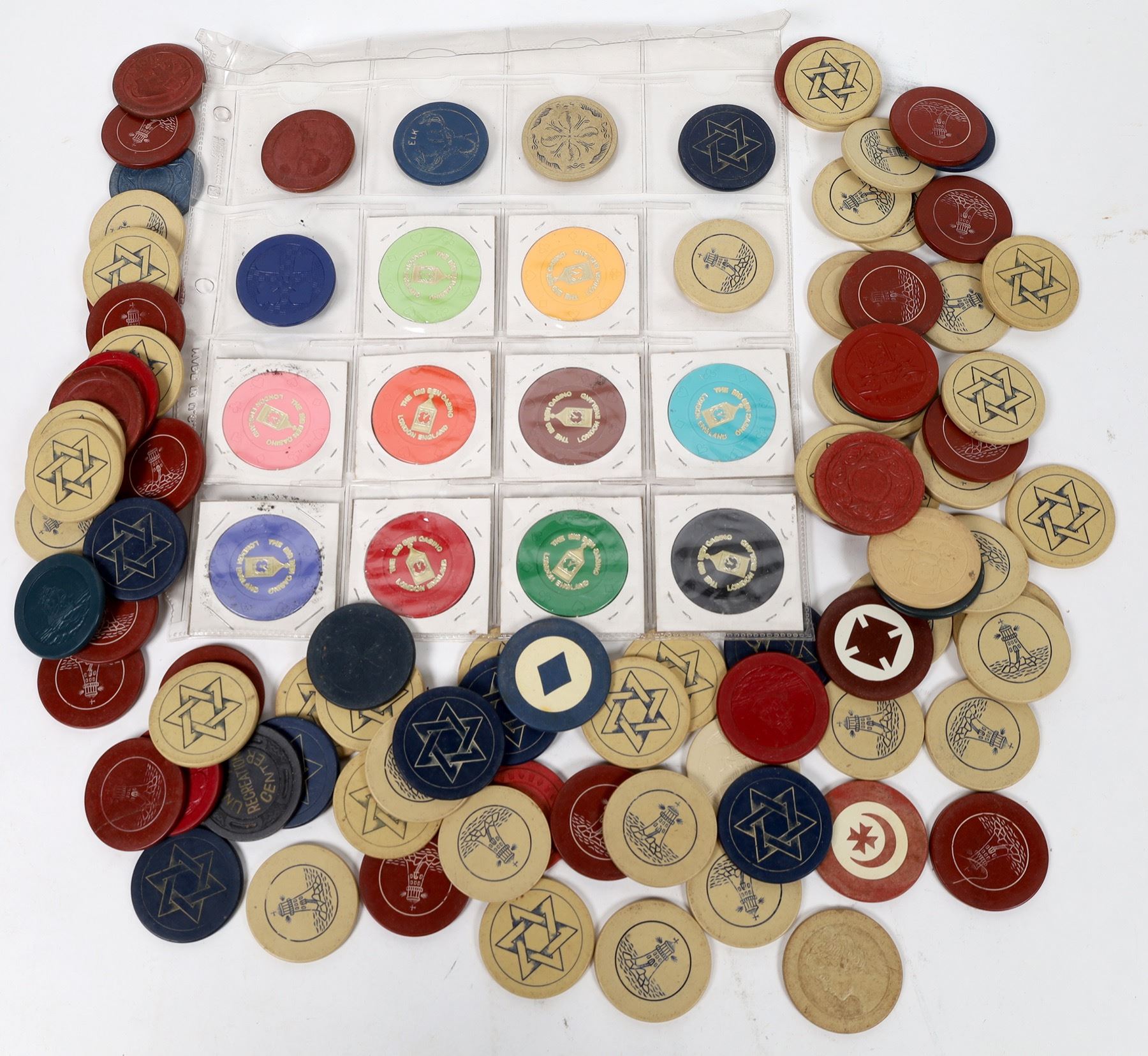 Cigar box with over a hundred vintage chips with a lighthouse, the Star of David, or cats playing poker. Also ten colorful chips from the Big Ben Casino London England. Denominations from $1 through $10,000.