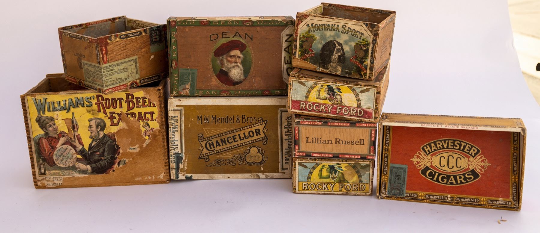 Williams Root Beer Extract with partial paper labels. Cigar boxes-2x Montana Sport, Dean Perfectos, Harvester, 2x Rocky Ford including 1 rarity, WM Mendel and Bros., Lillian Russell. State: City: Date: Provenance: Stuart MacKenzie Montana Collection