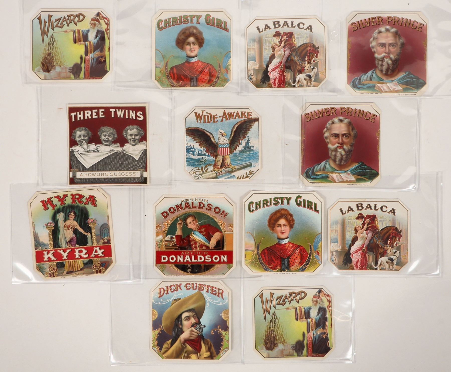 Collection of 13 cigar labels (9 different), c1920s. Bright and colorful designs. Includes two each of the following: Wizard, La Balca (Calvert Lith. Co, Detroit), Silver Prince (Heywood, Strasser & Voigt Litho. Co. N.Y.), and Christy Girl (Lee Heine, Maryland Litho. Co., Balt O); and one each of Kyra (Kyra Cigar Co.), Wide-Awake, Three Twins, Dick Custer and Arthur Donaldson (F.C. Lundquist, Chicago). The Arthur Donaldson label is copyright July 1926, others undated. Each 4.5" x 4".