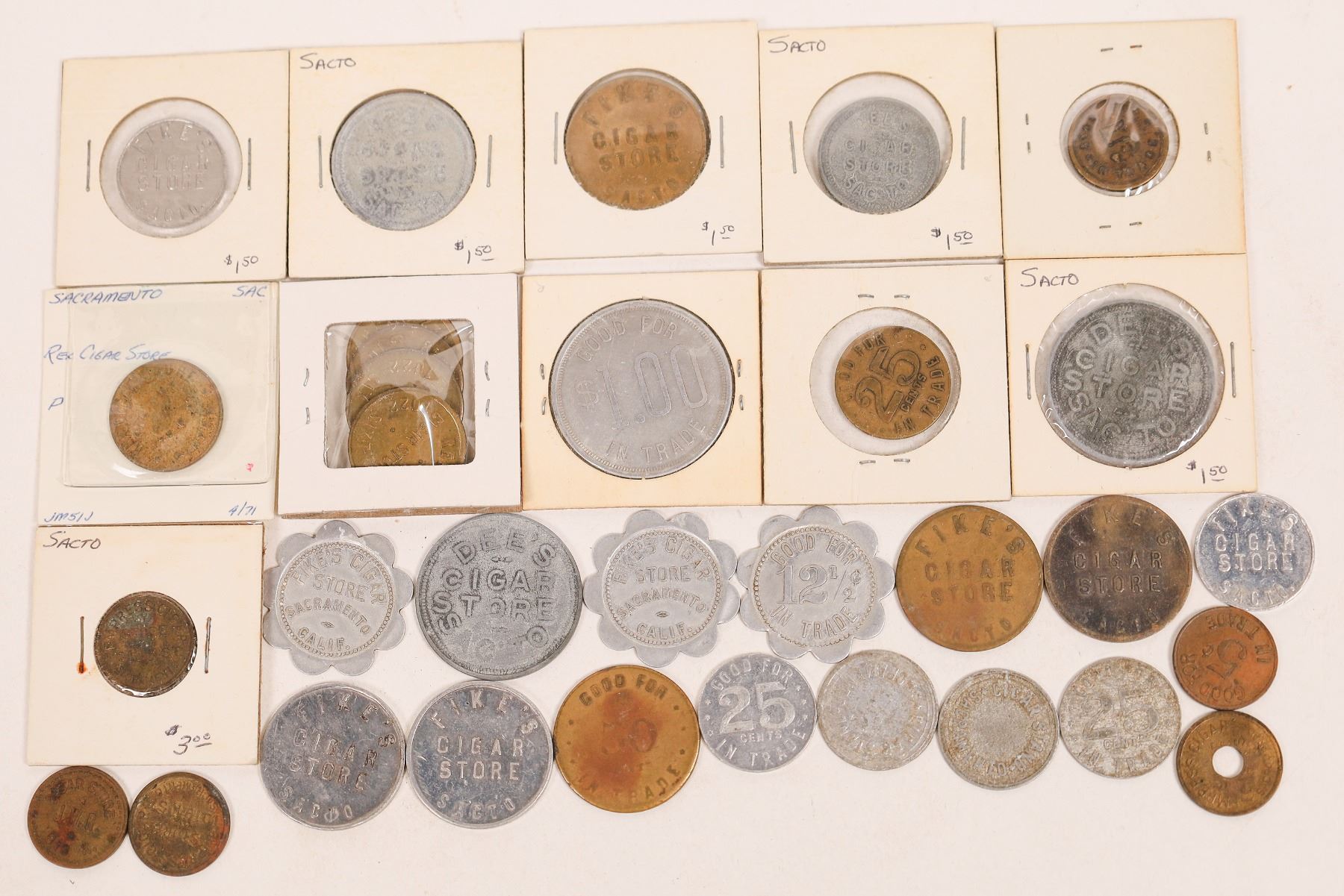 Dealer lot of over 30 duplicate cigar shop tokens from Sacramento. Ex: Ron Lerch collection.