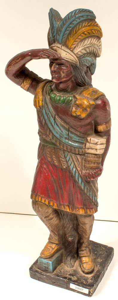 This is a counter top model of the hand carved wooden Cigar Store Indians which stood in front of tobacco shops to advertise their wares. This two foot tall model was made by the Artistic Latex Foam Company, in New York, in the early 1960's. It is made of molded latex, wood grained, and painted in blues, whites, reds, and yellows. This Indian chief shows a bit of wear. Embossed mark on the back of the base "A.L.F. Co. N.Y."