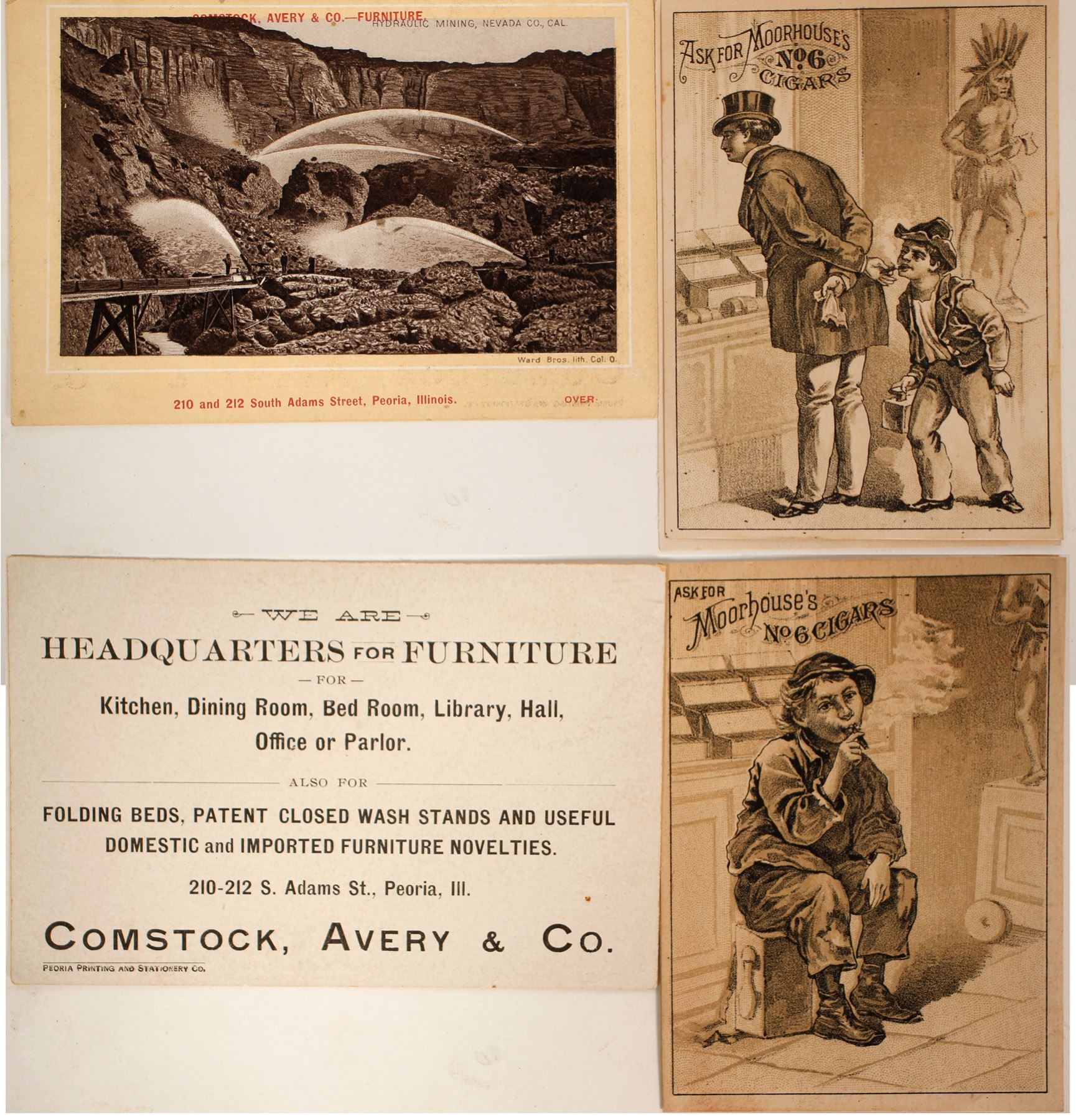 2 nice tradecards. Moorhouse's cigars with a boy smoking a cigar on both sides. Comstock & Avery, Peoria, ILL with Malakoff Diggins hyrdaulic scene on front. James Mackie Collection
