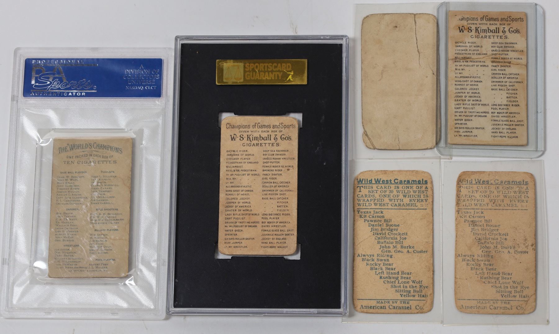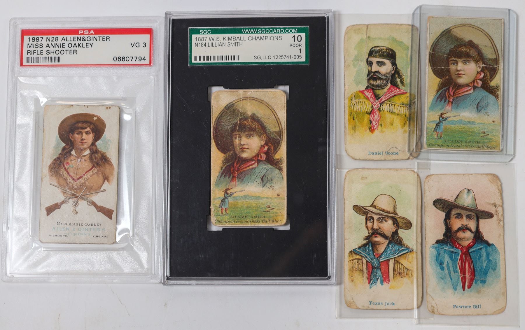 This lot contains 6 cigarette cards; one of "Miss Annie Oakley" VG condition 1887 Allen & Ginter Tobacco card cased; two of Lillian Smith a trick shooter and rider that joined the Wild West Show in 1886 as Annie Oakley's rival, cards in fair condition, W. S. Kimball cigarettes cased; one card of Daniel Boone in poor condition; one of Texas Jack good condition; and one of Pawnee Bill who became the successor to Buffalo Bill, in fair condition. The story goes that Annie Oakley learned to shoot her own dinner because her family could not afford to feed her. 1.5 in. X 3 in. each. Please see photos for details.