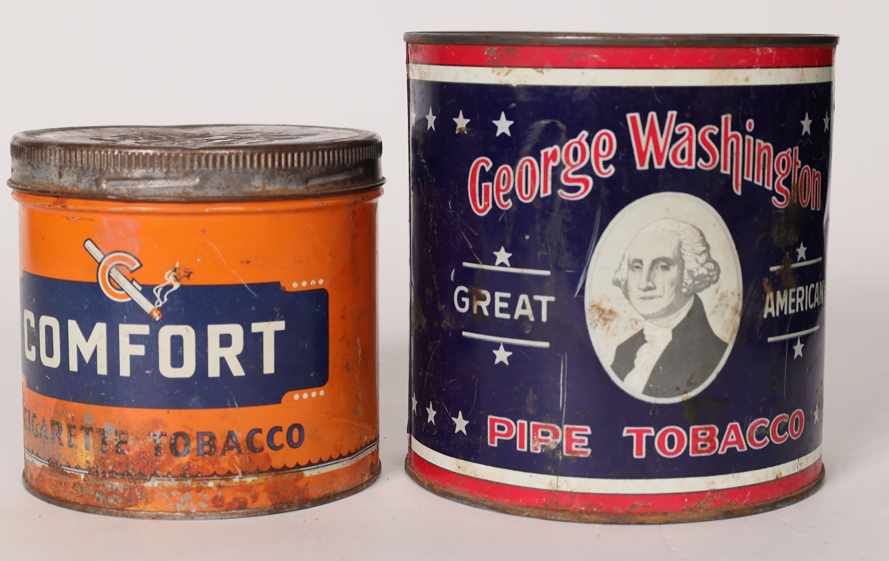 Tobacco tins (2) from a bygone era. Included is "C" Comfort Cigarette Tobacco, with lid and George Washington Great American Pipe Tobacco by R.J. Reynolds, with no lid. They are collectible condition with the usual dents and scratches. Please see photos for more detail. Winston-Salem North Carolina