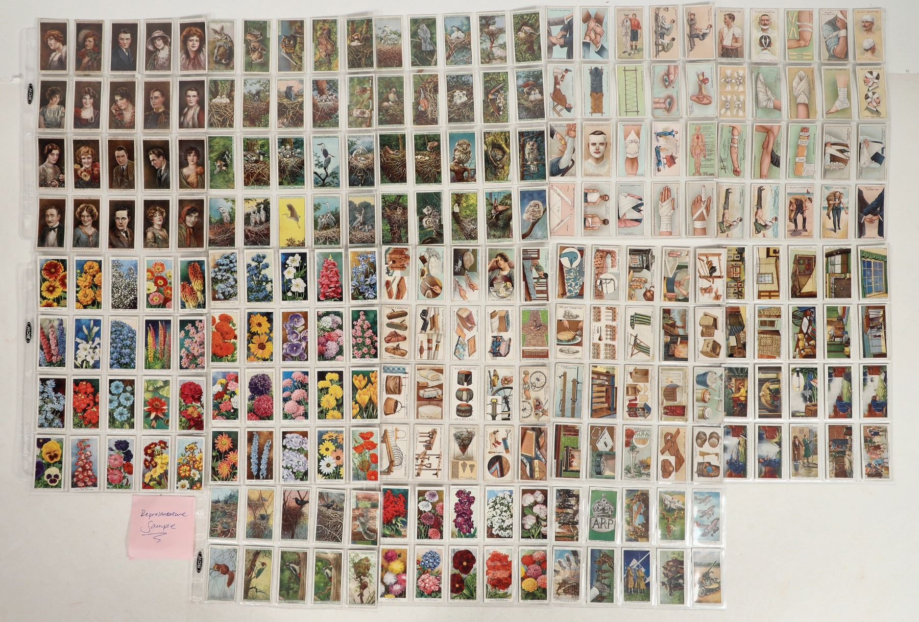 WD & HO Wills, Imperial Tobacco Company, John Player's & Sons, Richard Lloyd & Sons, Will's Cigarette, etc trading cards. These collectable cards ran in series. This vast collection of upwards of 275 cards contain series such as Will's "Life in the treetops", "Household hints", & "First aid". Collection has not been assessed for completeness (whether all 50 First Aid series are accounted for) or whether any cards are duplicates, though this collection does give the impression of having complete or near-complete series with minimal duplicate cards. All cards appear to be in good to fair condition, with mild foxing present on a minority of cards. Generally, these trading cards have gorgeous color lithographs on one side, and trivia facts on the reverse side. Cards are generally about 1.3x2.6" though the Gallaher cards are 1.5x2.5" and other card series vary slightly. See photo.