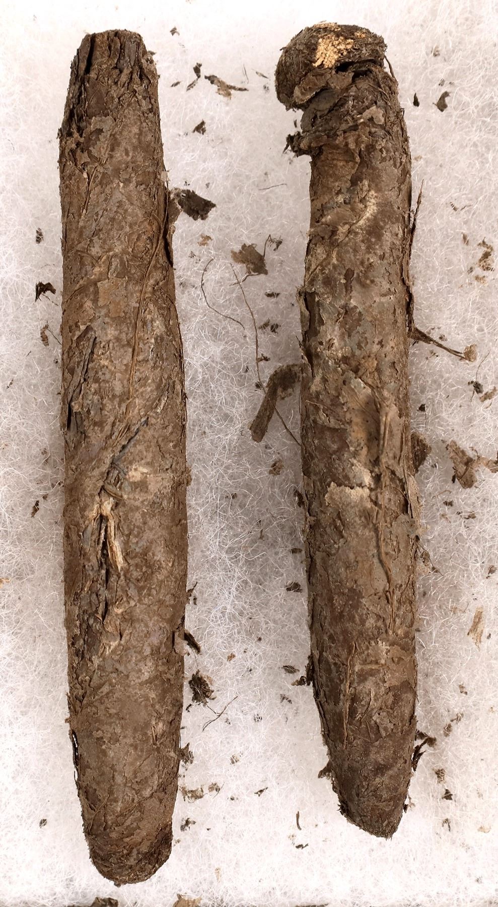 2 cigars. Wrappers partially intact with some degradation. 5 inches x 1/2 inch