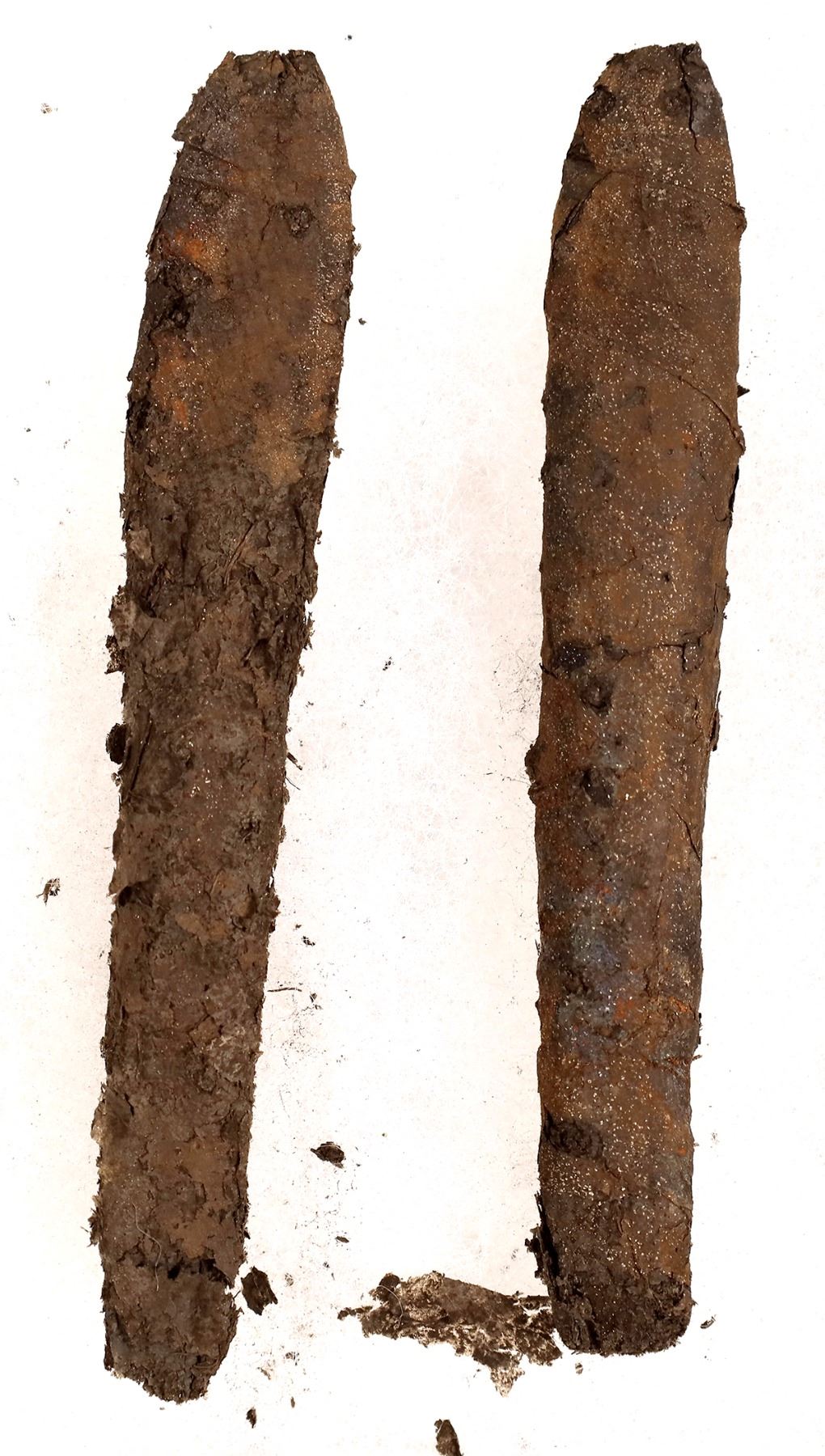 2 cigars with wrappers intact with some degradation. Approx. 4.5" x 1/2" wide.