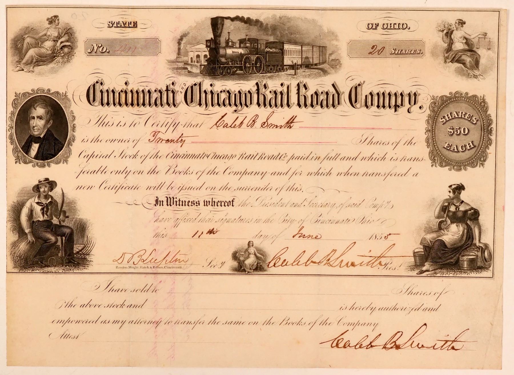 Thirty six common shares issued to and signed by Caleb B. Smith as president. Caleb Smith was an Indiana politician that helped Abraham Lincoln secure the 1860 presidential nomination. He was rewarded by being named Secretary of the Interior from 1861-62 and then a U.S. District Court Judge (coxrail.com). The shares were $50 each. Multiple vignettes include a steam engine right to left in front of a roman style building. Nice clear signature from Smith. Uncancelled.