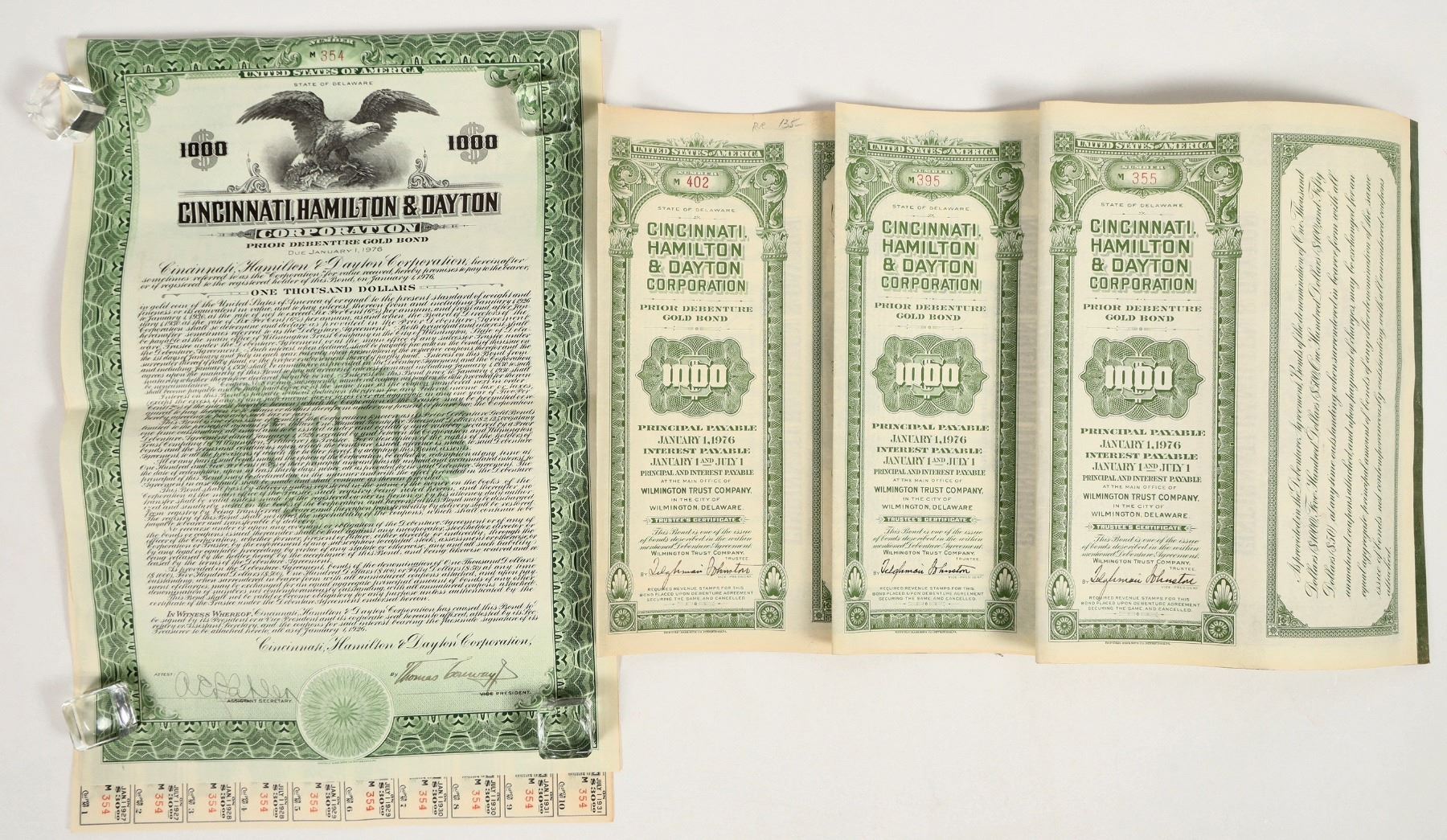Lot of 4. I/U. Issued 1926. EF cond. Cincinnati, Hamilton & Dayton Corp., $1000, 6% gold bearer bonds, coupons attached. Republic BNC printer.