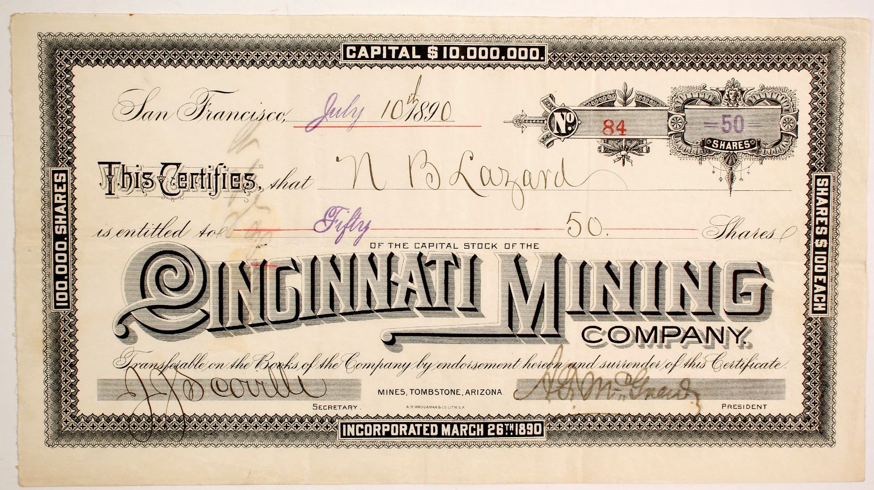 # 84 for 50 shares to NB Lazard. Signed by JJ Scoville and president A McGnew(?). Dateline 1890 San Francisco. Not cancelled. AH Waugaman printer. Slightly wrinkled, otherwise excellent. Mines were worked heavily in this area in the 1880's but there was no significant production. [Burchard, 1882] Prag Collection