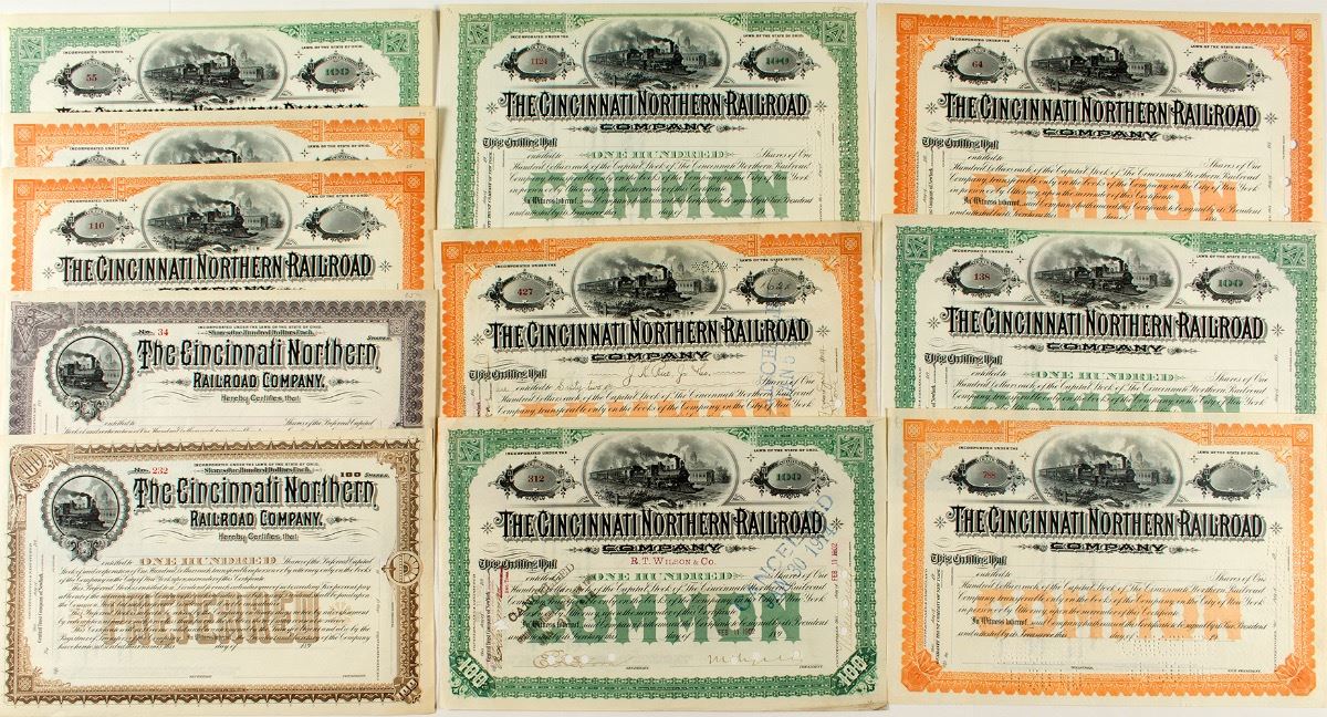 Eleven certificates: two are issued (1902 & 1909, stamp and punch cancelled), while nine are unissued. Good variety (orange, green, brown, grey borders) with all featuring one of two locomotive profile vignettes. (Prag Collection) City: Cincinnati State: Ohio Date: 1902-1909 hwac# 33950