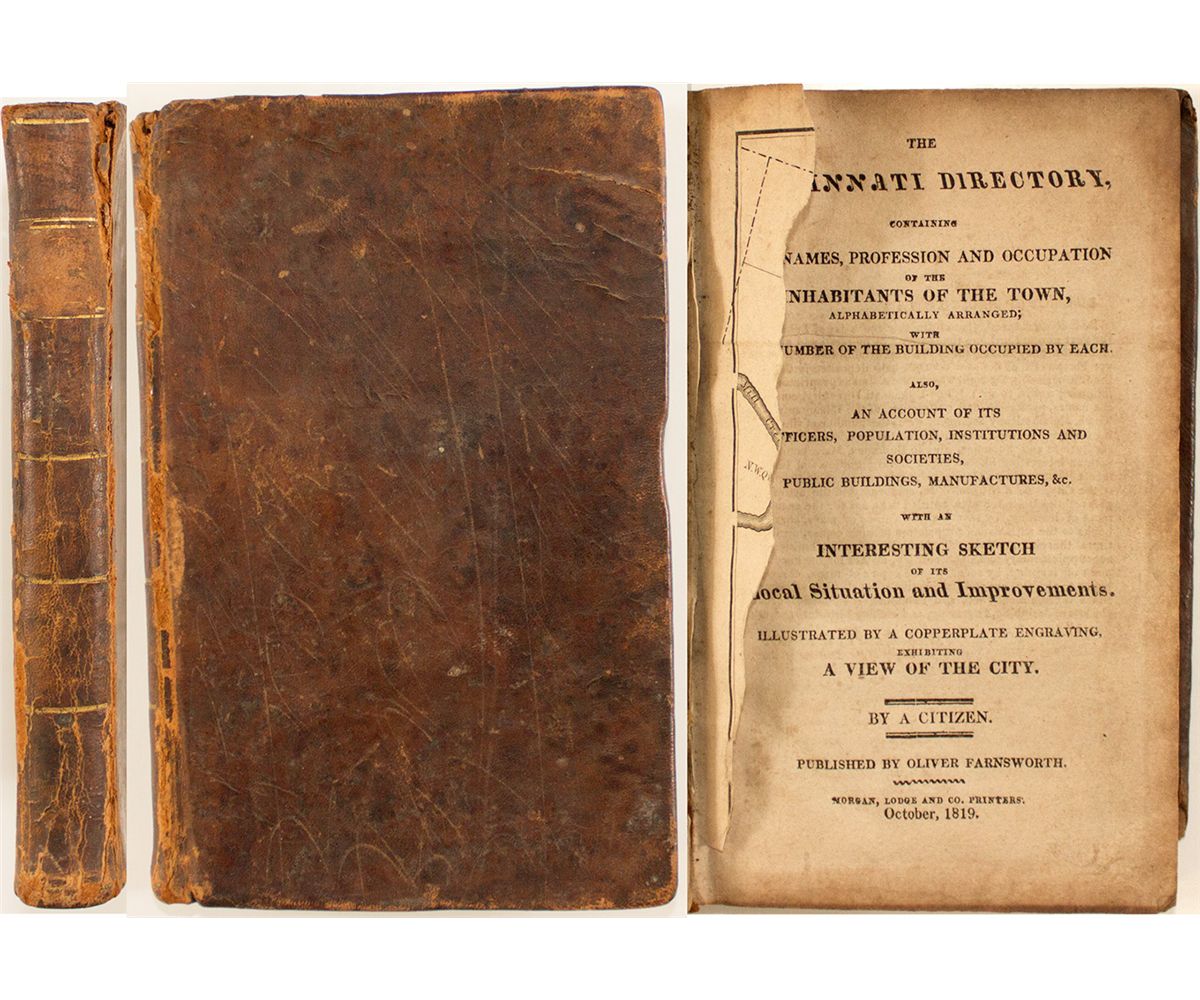 Very early directory. The Cincinnati Directory, containing the names, profession and occupation of the inhabitants of the town, alphabetically arranged; with the number of the building occupied by each. Also, an account of its officers, population, institutions and societies, public buildings, manufactures, &c. Leather. 156 pages. Begins with an almanac for 1820. Listings are somewhat alphabetical. Has general index at the end based on categories. Published by Oliver Farnsworth. Morgan, Lodge and Co. Printers. October, 1819. Condition: soiling and heavy toning. Rear cover corner chipped off. Front map/plate torn out. Rarity: [v]City: CincinnatiCounty: State: OHDate: