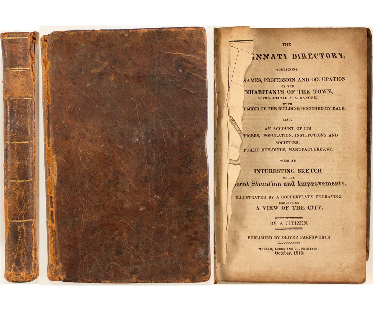 Very early directory. The Cincinnati Directory, containing the names, profession and occupation of the inhabitants of the town, alphabetically arranged; with the number of the building occupied by each. Also, an account of its officers, population, institutions and societies, public buildings, manufactures, &c. Leather. 156 pages. Begins with an almanac for 1820. Listings are somewhat alphabetical. Has general index at the end based on categories. Published by Oliver Farnsworth. Morgan, Lodge and Co. Printers. October, 1819. Condition: soiling and heavy toning. Rear cover corner chipped off. Front map/plate torn out. Rarity: [v]
