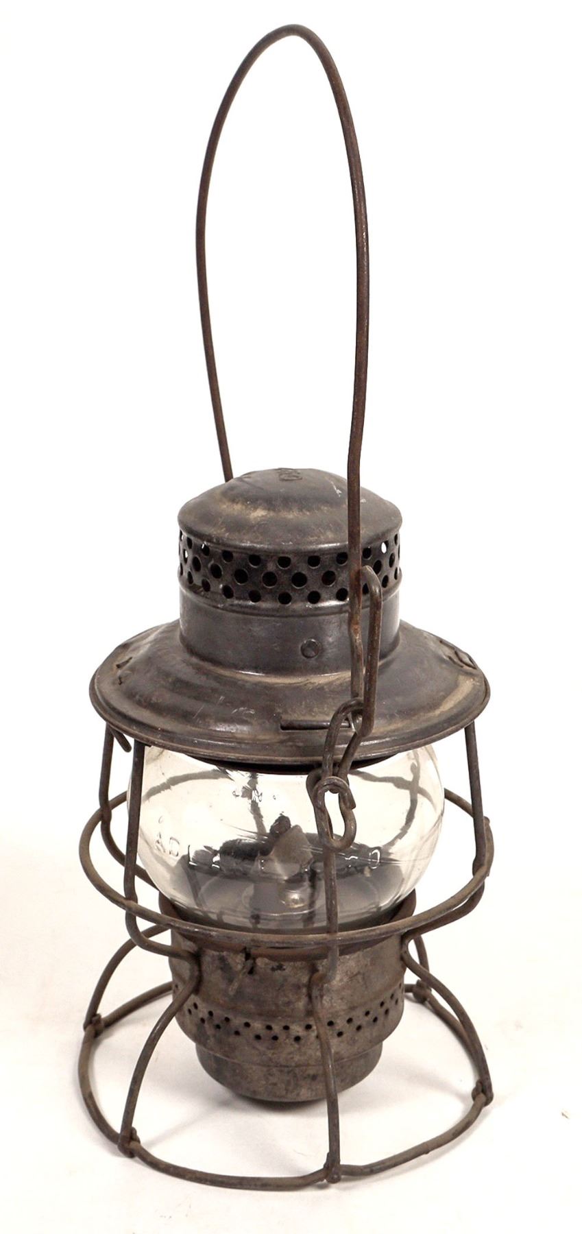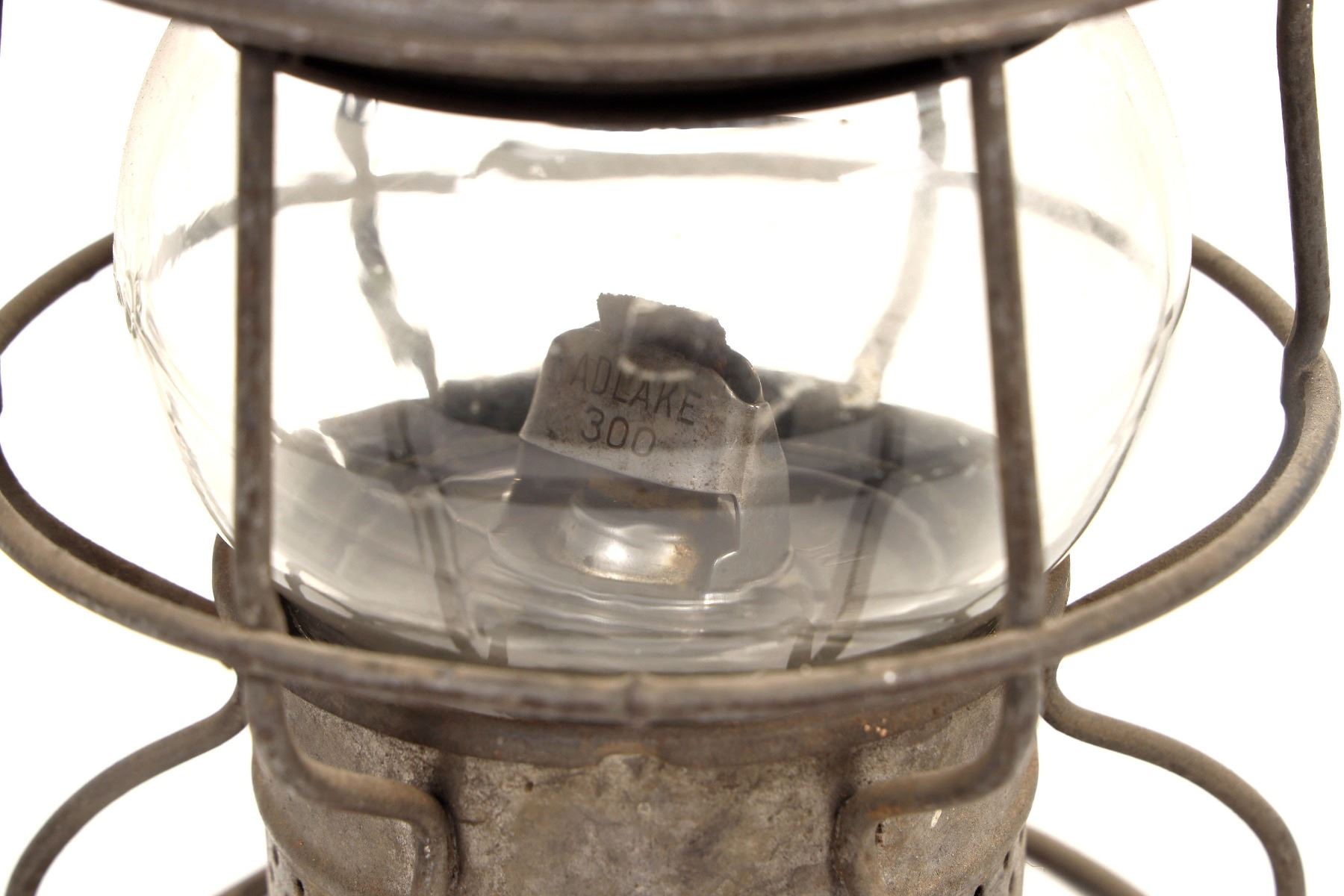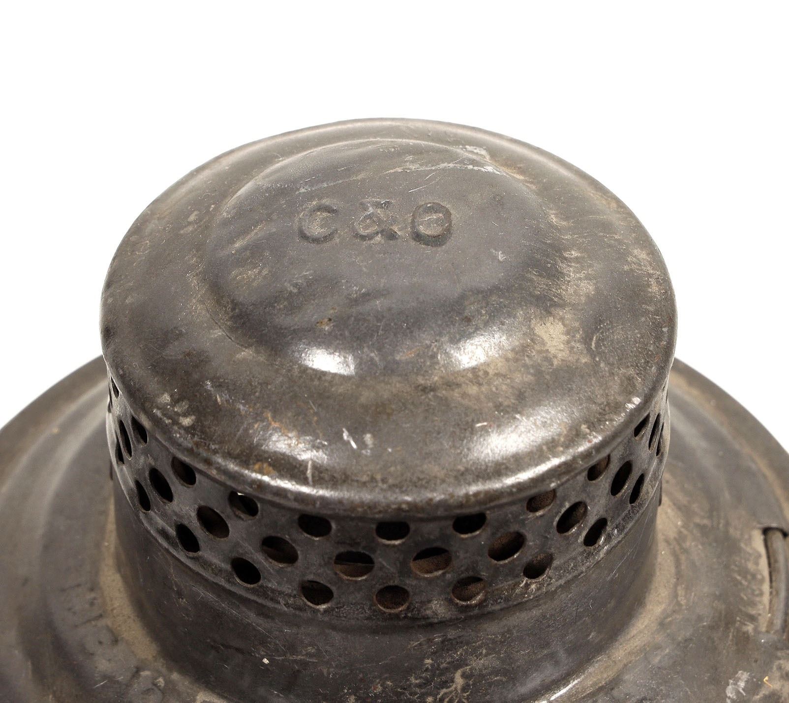 White metal Adlake 300 railroad lantern with C & O embossed on top cap. Clear globe without apparent chips or cracks. 14" with handle.