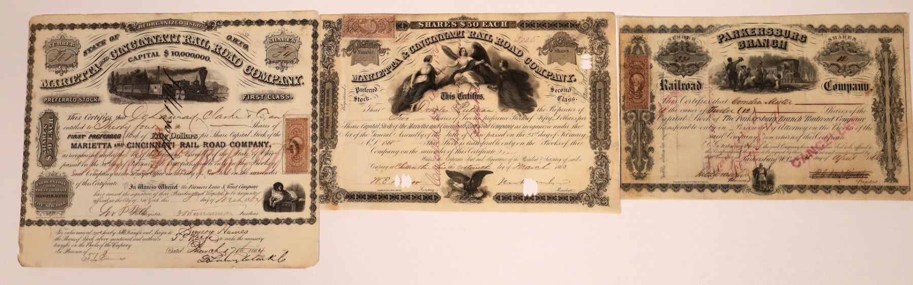Lot of three nice Civil War era Railroad stocks; all with revenue stamps. 1) Marietta & Cincinnati Rail Road. #1183 issued in 1863. 25c revenue stamp. Pen cancelled in 1869. 2) Different Marietta & Cincinnati Rail Road. #368 issued in 1864. Stamp cancelled. Different than number 1. During the 1860s construction began again on the Marietta & Cincinnati Railroad. By 1866, the line had reached Cincinnati, crossing Ohio through the south-central part of the state. The line prospered during the late 1860s and the early 1870s, as the iron producing regions of Ohio in Jackson and Hocking counties now had an easier means of shipping the iron ore to Cincinnati. 3) Parkersburg Branch Railroad. #330 issued in 1866. Stamp cancelled. State:Ohio City:Cincinnati Date: Provenance: