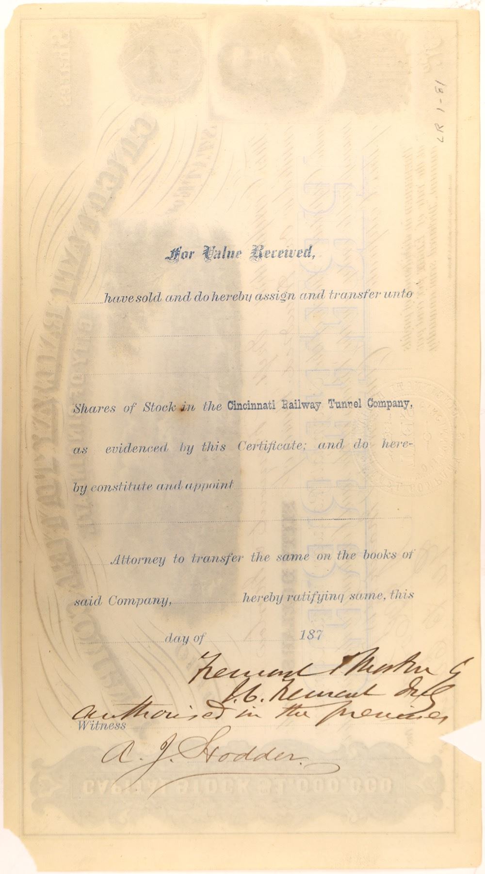 Cincinnati Railway Tunnel Company Stock with a John C Fremont Autograph on Reverse  [130066]