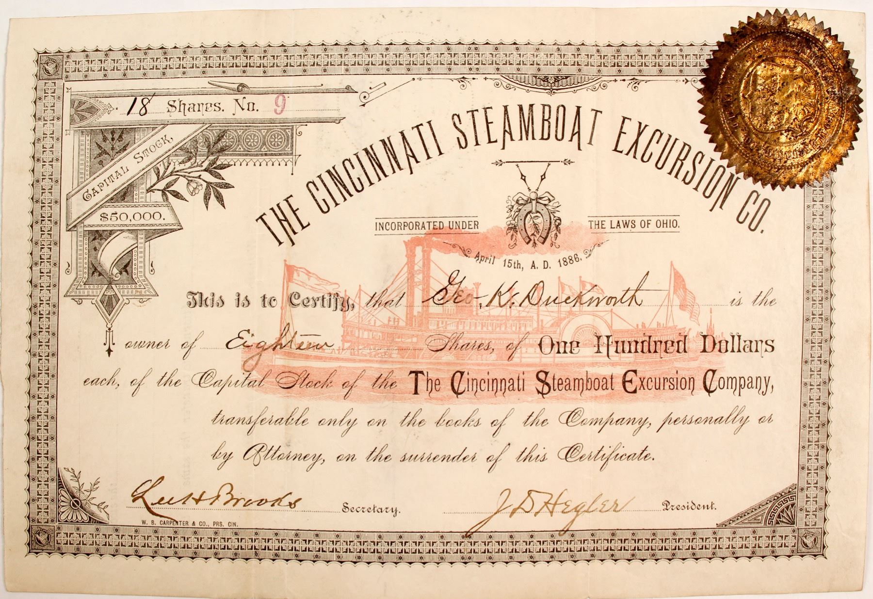 Choice stock. I/U #9 Geo Duckworth 18 shares signed by President Hegler. Underprint mauve steamship vignette. Inc in OH. Gold seal. Rear toning. Prag Collection. State: Ohio City: Date: HWAC# 83374