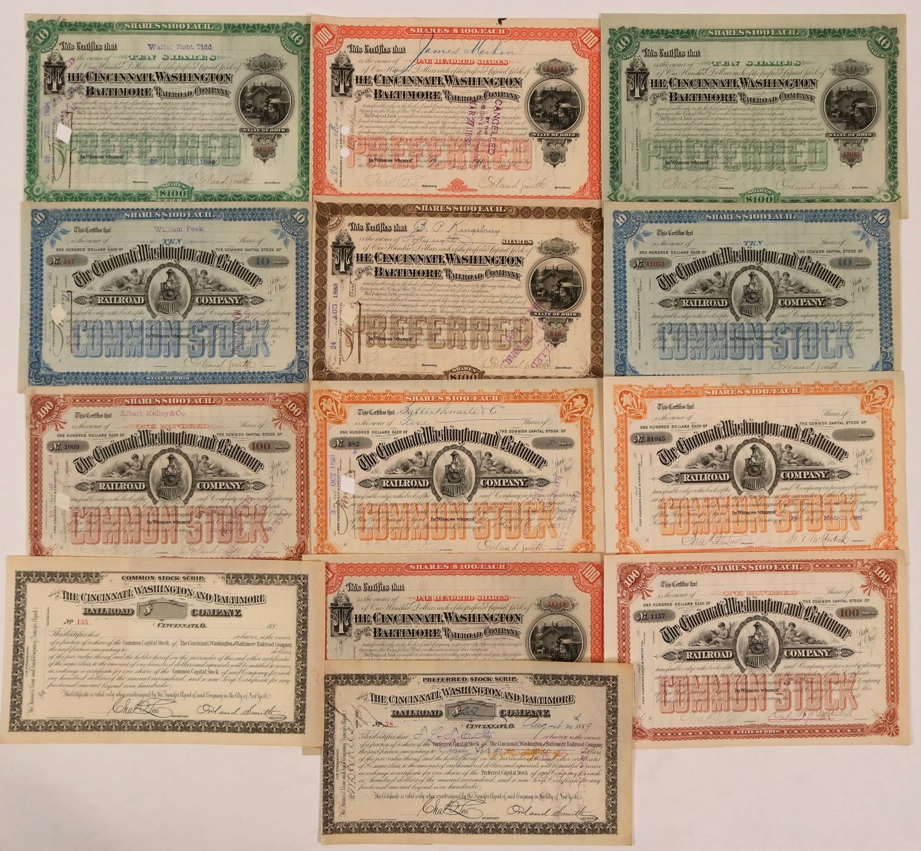Nice group from this railroad. Lot includes 3 common stocks and 3 preferred stocks all issued in the 1880's and all signed by Orland Smith as president. 100, 10, and odd shares of each type so three different colors of common and of preferred. Orland Smith (May 2, 1825 – October 3, 1903) was a railroad executive and a brigade commander in the Union Army during the American Civil War. In 1864, he led a spirited bayonet charge during the Battle of Wauhatchie that took a significant Confederate position on a hill that now bears his name (wiki). Also, 5 partially issued (signed) certificates, signed by Orland Smith or by McClintock. Then, two scrip certificates, one issued in 1889 and signed by Smith, and the other partially issued (signed) by Smith.