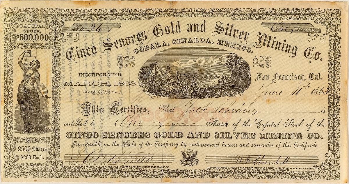 From the Cinco Senores Gold and Silver Mining Co. of Copala, Sinaloa, Mexico. The company was incorporated in 1863 in S.F. Issued to Jacob Schreiber for one share (at $200 each), signed by H. B. Churchill as president and J. Armstrong as secretary (a professional mining secretary). There is a 25c revenue stamp affixed to the reverse. Jacob Schreiber is listed in the 1863 S. F. Directory with a residence. The certificate was printed by Valentine & Co. of San Francisco. There are 2 nice vignettes, both at the center and on the left. It has light foxing on the top edge and a few spots here and there, but is otherwise in very fine condition. City: Sinaloa State: zMexico Date: 1863 hwac# 33098