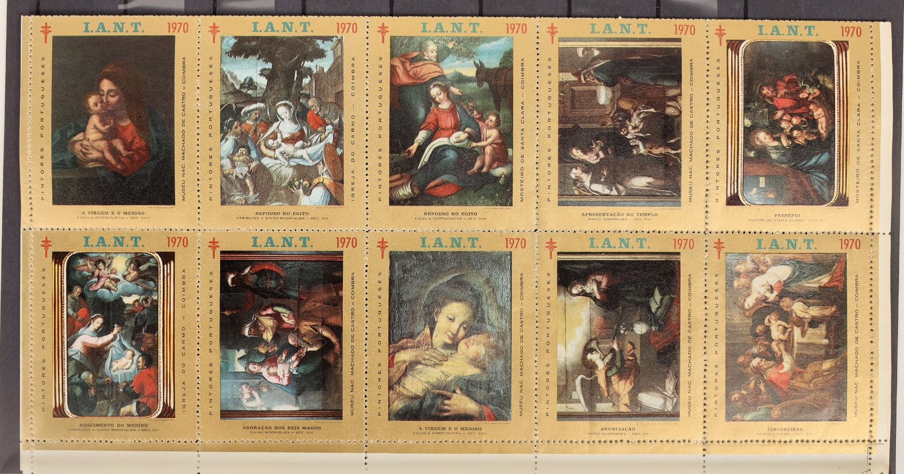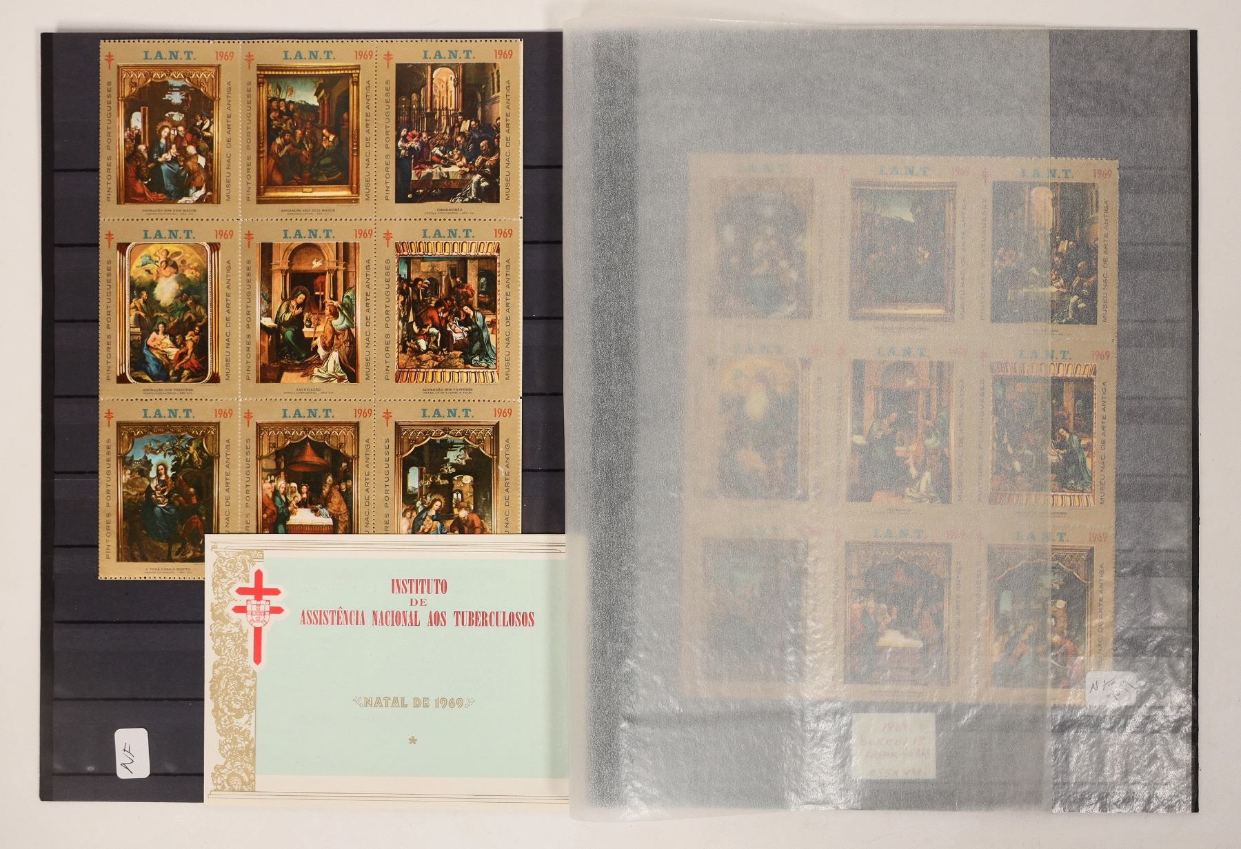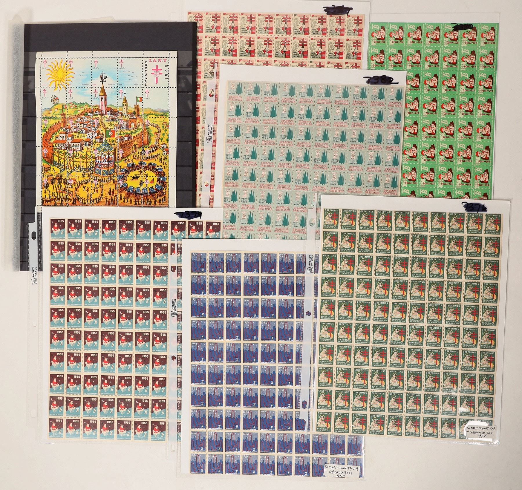 5 sheets of Summit County TB Christmas stamps, c. 1952-64. 1968 Portugal Christmas sheet. 1970 folded sheet of Portugal paintings.[