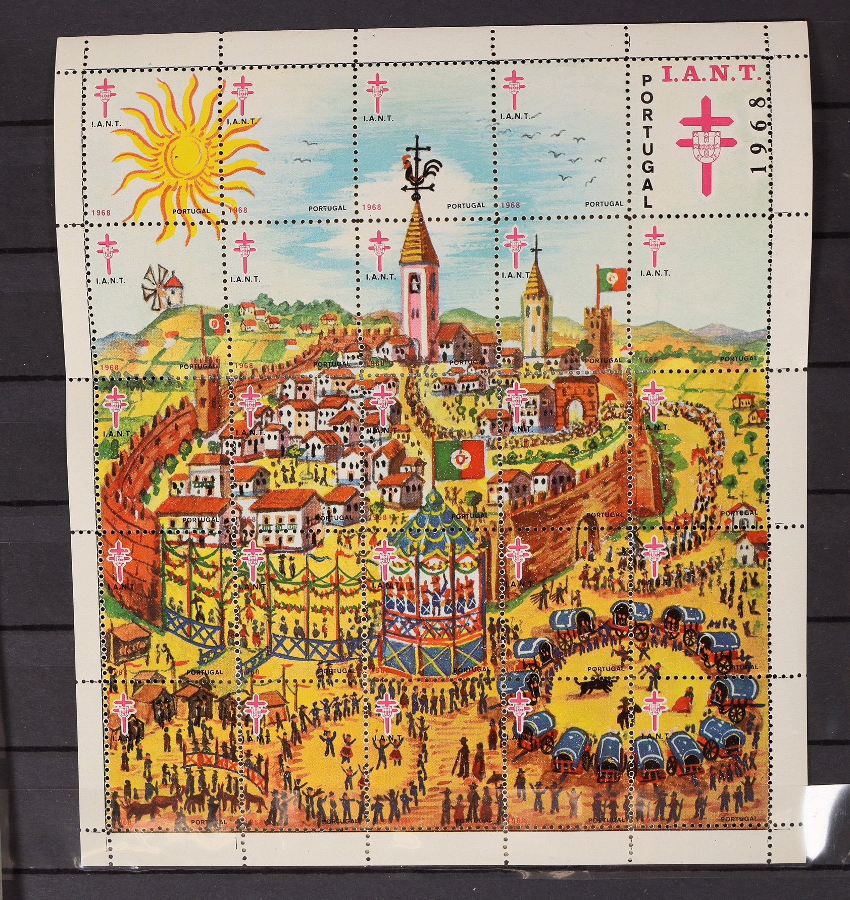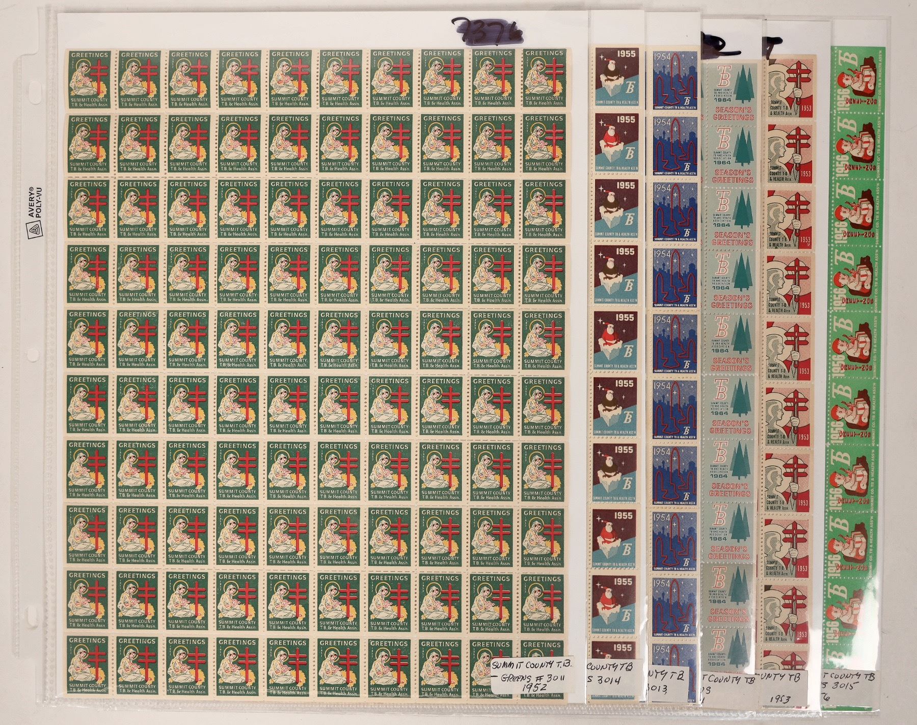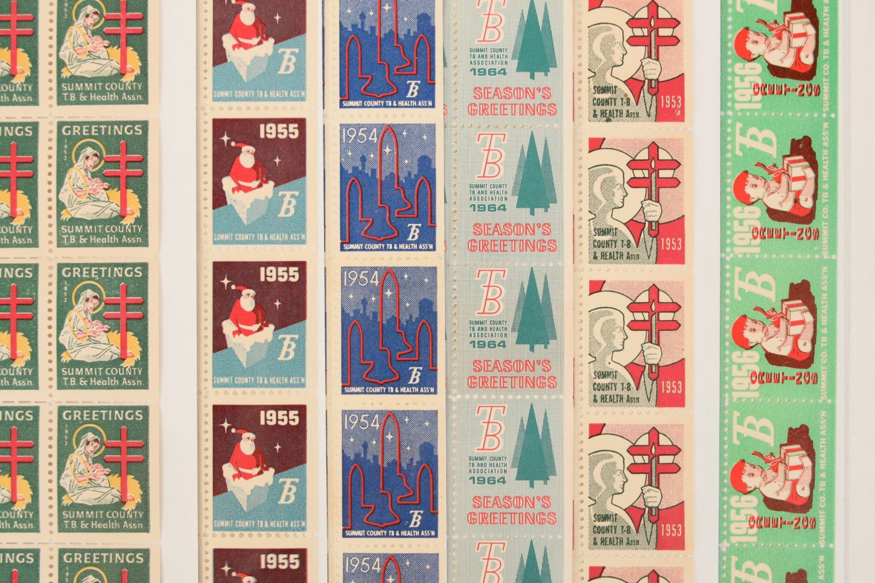 5 sheets of Summit County TB Christmas stamps, c. 1952-64. 1968 Portugal Christmas sheet. 1970 folded sheet of Portugal paintings.[