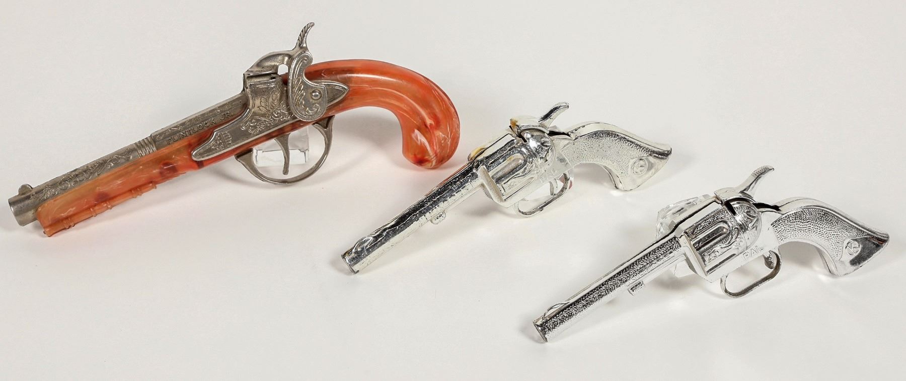 There are three guns in this lot: two are Circle-K cap pistols at 6 in. long; and one Hubley percussion lock single shot cap pistol. Please see photos for details.