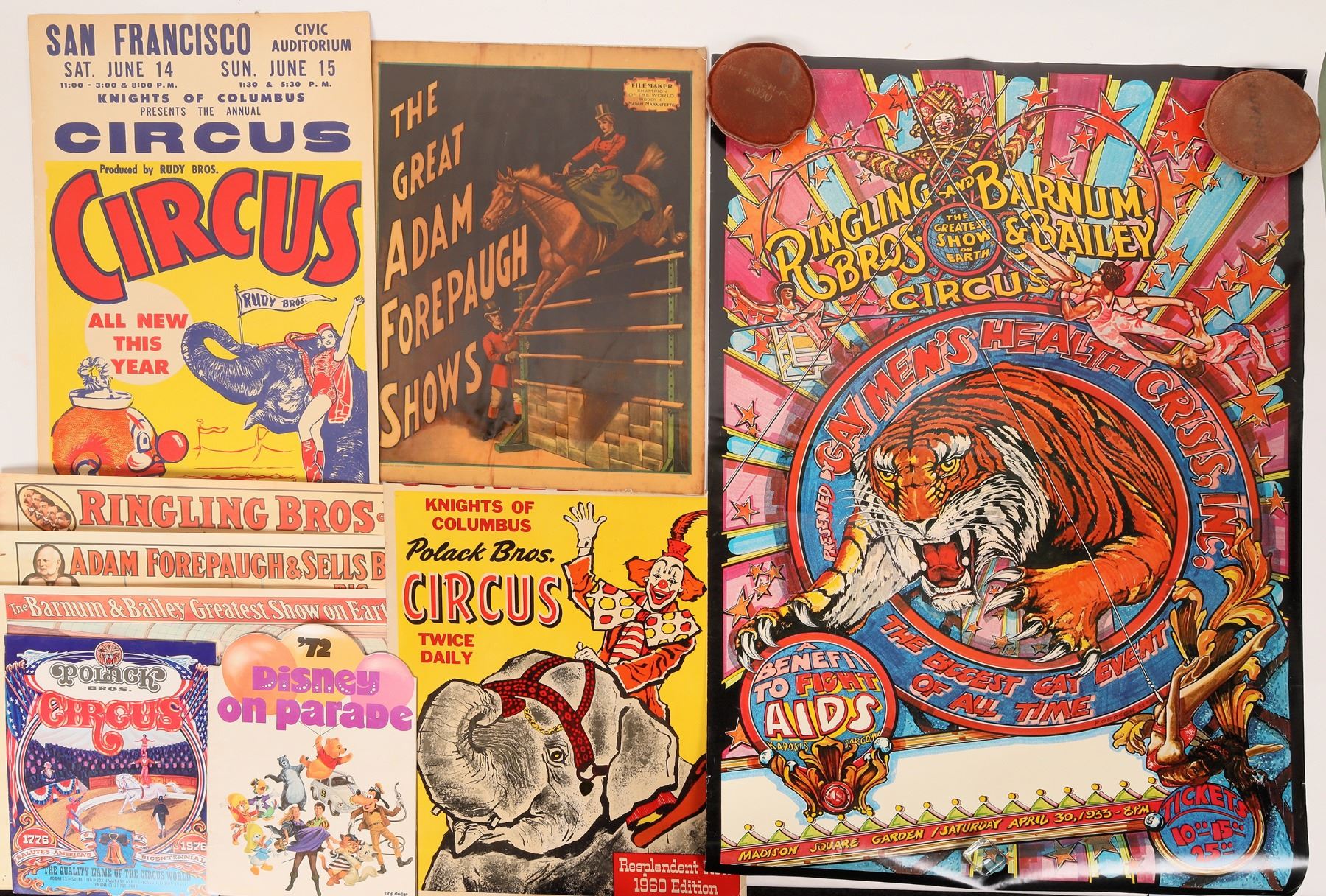 1.) "Knights of Columbus" Annual Circus, at S.F's Civic Auditorium on June 14th & 15th, produced by Rudy Bros. (Measures 14" x 22", on cardboard) 2.) "The Great Adam Forepaugh Shows" ~ "Firemaker", Champion of the World, Ridden by Madam Marantette (Copyright 1960, circus World Museum~ 13 ½ x 19" mounted on cardboard) 3.) "Knights of Columbus", Polack Bros. Circus~ Resplend ent New 1960 Edition~ (15" x 17 ½", on cardboard) 4.) Circus World Museum~ Colorful prints (3), representing circuses by Barnum & Bailey, Adam Forepaugh & Sells Bros. and Ringling Bros.~ (19" x 13") 5.) Polack Bros. Circus Program, salutes America's Bicentennial, 1776-1976 ~ (4 page 8 ½" x 11" booklet) 6.) '72 Disney on Parade" Program, (8 ½" x 12" all in color book let, 20 pages) 7.) Ringling Bros. & Barnum & Baily Circus Poster, "The Greatest Show on Earth"~ Presented by Gay Men's Health Crisis Inc.~ Madison Square Garden, Saturday, April 30, 1980, 8 P.M. ~ (23"w X 35"h)