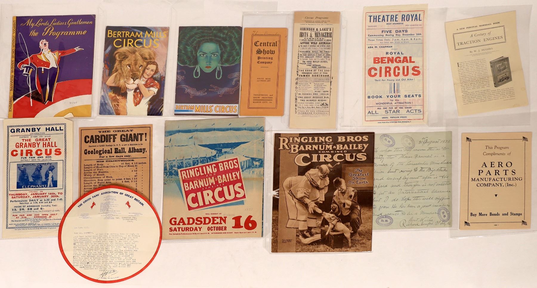 Large collection of circus history: Ringling Bros. & Barnum & bailey combined circus programs: Chattanooga, Oct. 24, 1935; Gadsden, Alabama Oct. 16, 1937; flyer for The Great Cardiff Giant!"; Granby Hall Circus, Leicester, England; Royal Bengal Circus, West Bromwich England; reproduction of an 1860 circus broadside; two Bertram Mills' Circus programs; Liverpool Stadium Circus Programme; Central Show Printing Company price list (theatrical and show pritners, Mason City, Iowa; 1937 letter from the Circus Fans' Association of Great Britain and other ephemera.