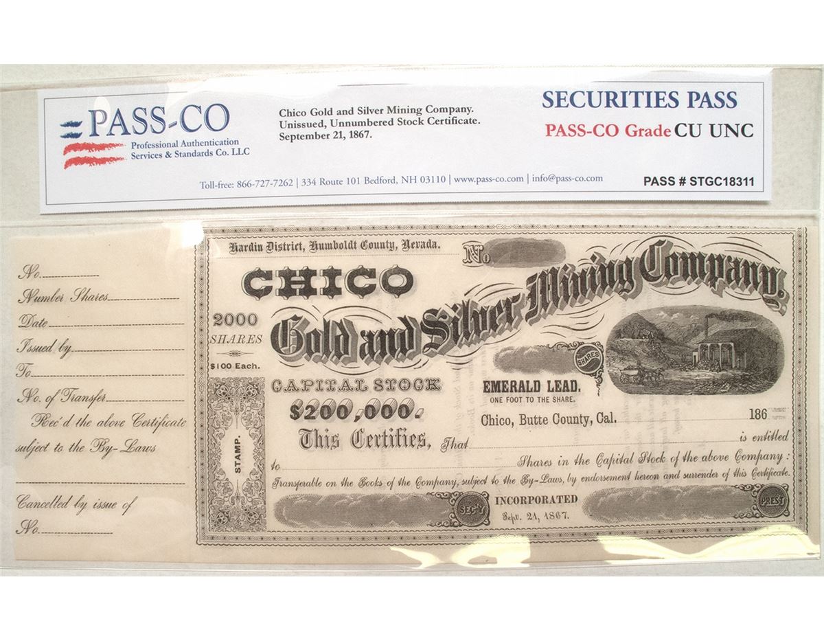 PASS-CO grade of Uncirculated! Esmeralda Lead in the Hardin District in Humboldt County. Issued in Chico, Butte, California. Incorporated on September 21, 1867. Unissued. Vignette of mill and horse and wagon.