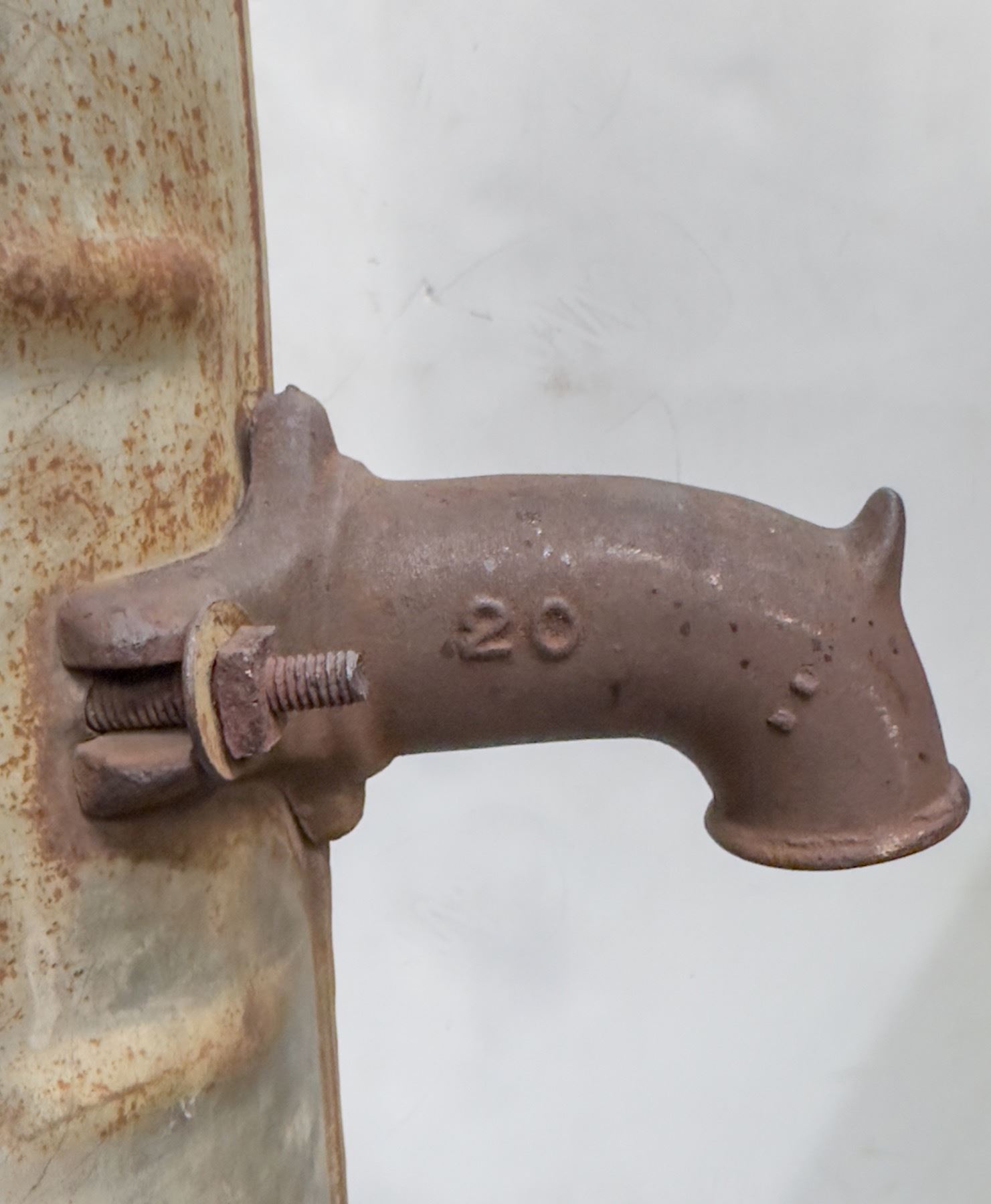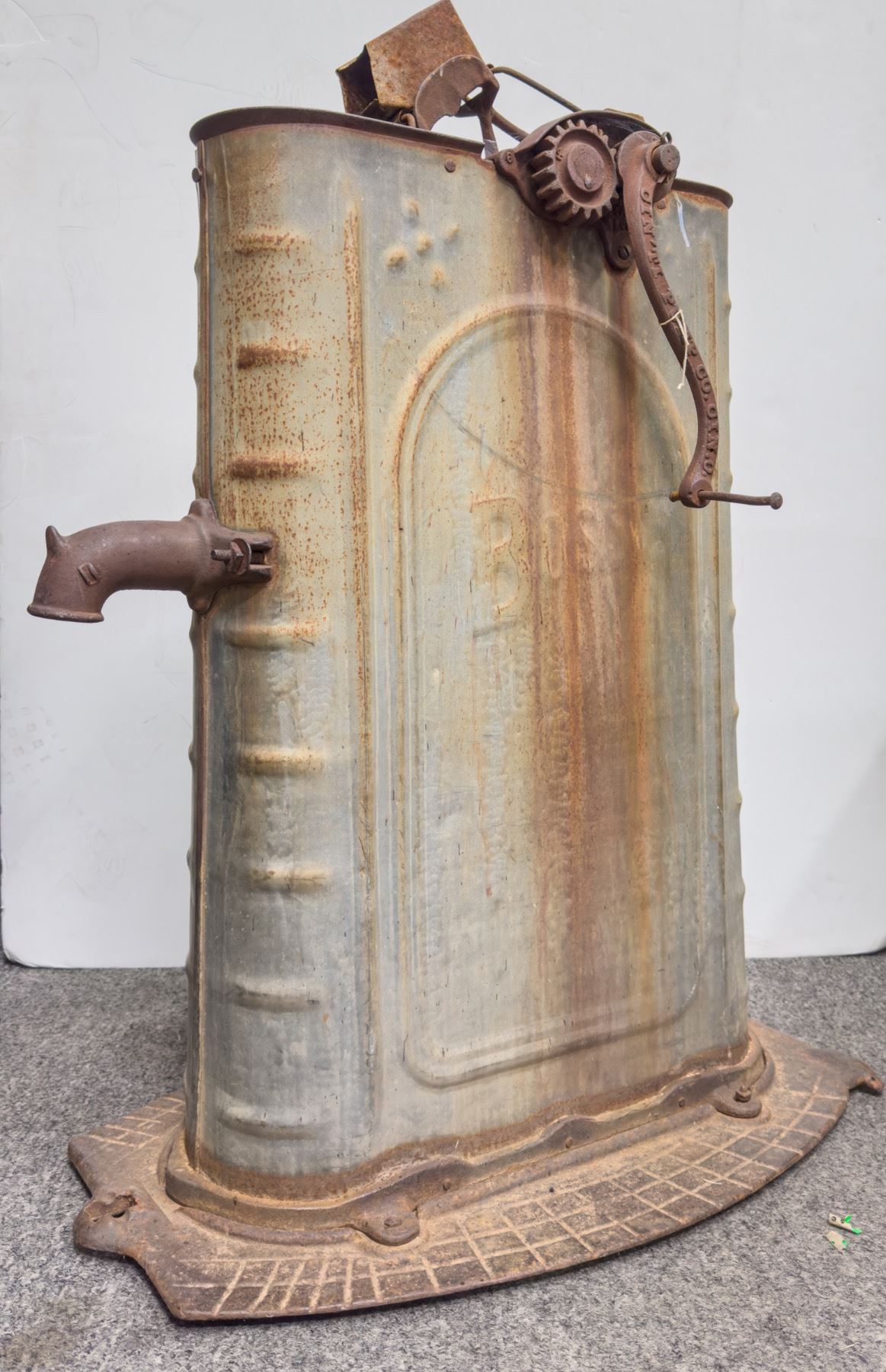 Boss brand antique believed to be a water cistern used for storing rainwater. The bottom and top lid of the cistern are missing, though the hand-crank operated wheel still moves fluidly. The piece is in fair condition, covered in rust, with raised lettering on the side of the water tank spelling "Boss". An extremely rare piece. See photo.