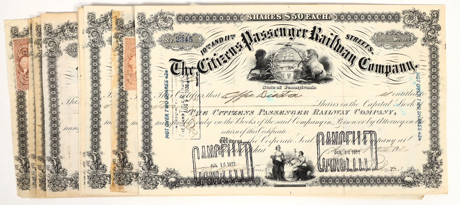 Ten issued stock certificates from The Citizens Passenger Railway Company. Vignettes top and bottom.