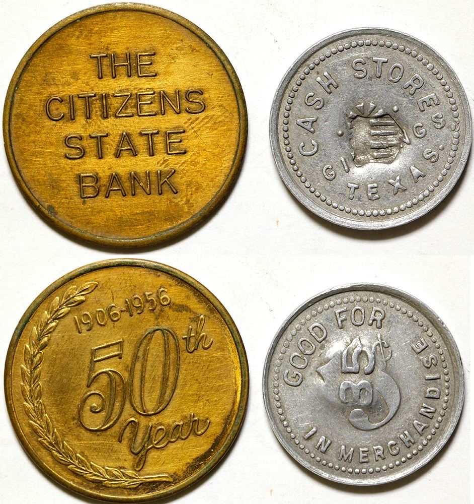 Two tokens. Citizens State Bank and Cash Store. Cash Store counter stamped. Giddings is a RR town founded in 1871, 75 miles east of Austin HWAC# 62739 Date: 1906 Location: Giddings, Texas
