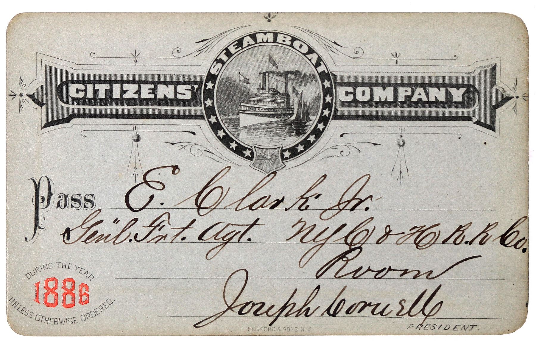 Pass issued to E Clark Jr. for 1886. Signed by president Joseph Coruell(?). Printed on grey/green cardstock with an ornate logo that has a steamboat vignette incorporated into it. Operated on the Hudson River and New York Harbor. Office in Troy. Good condition.