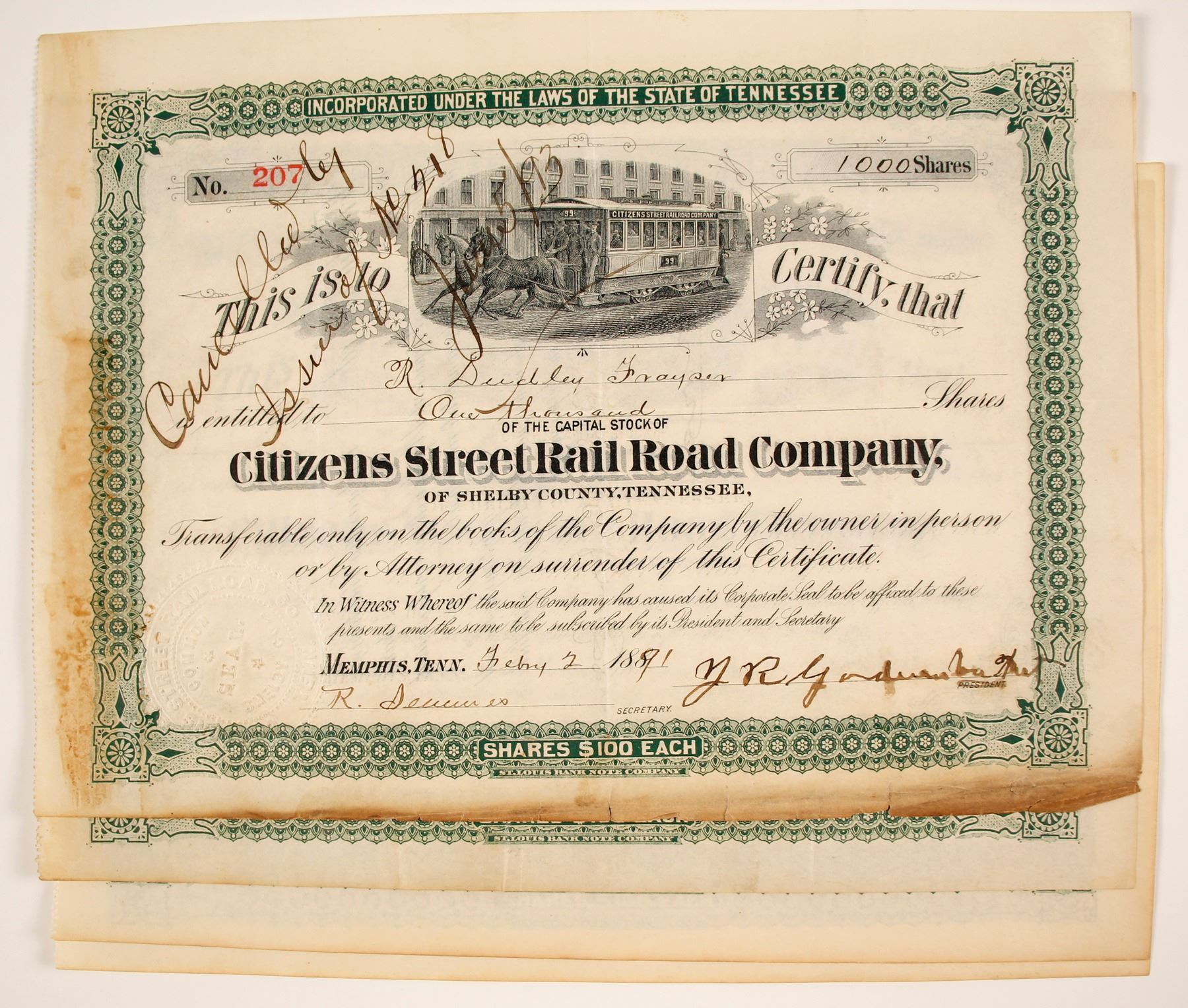 4 total certificates. 2 are signed and cancelled; in fair condition, some tears and discoloration. 2 are unsigned and unissued; in good condition. Vignette of horses drawing a trolly. Prag Collection.