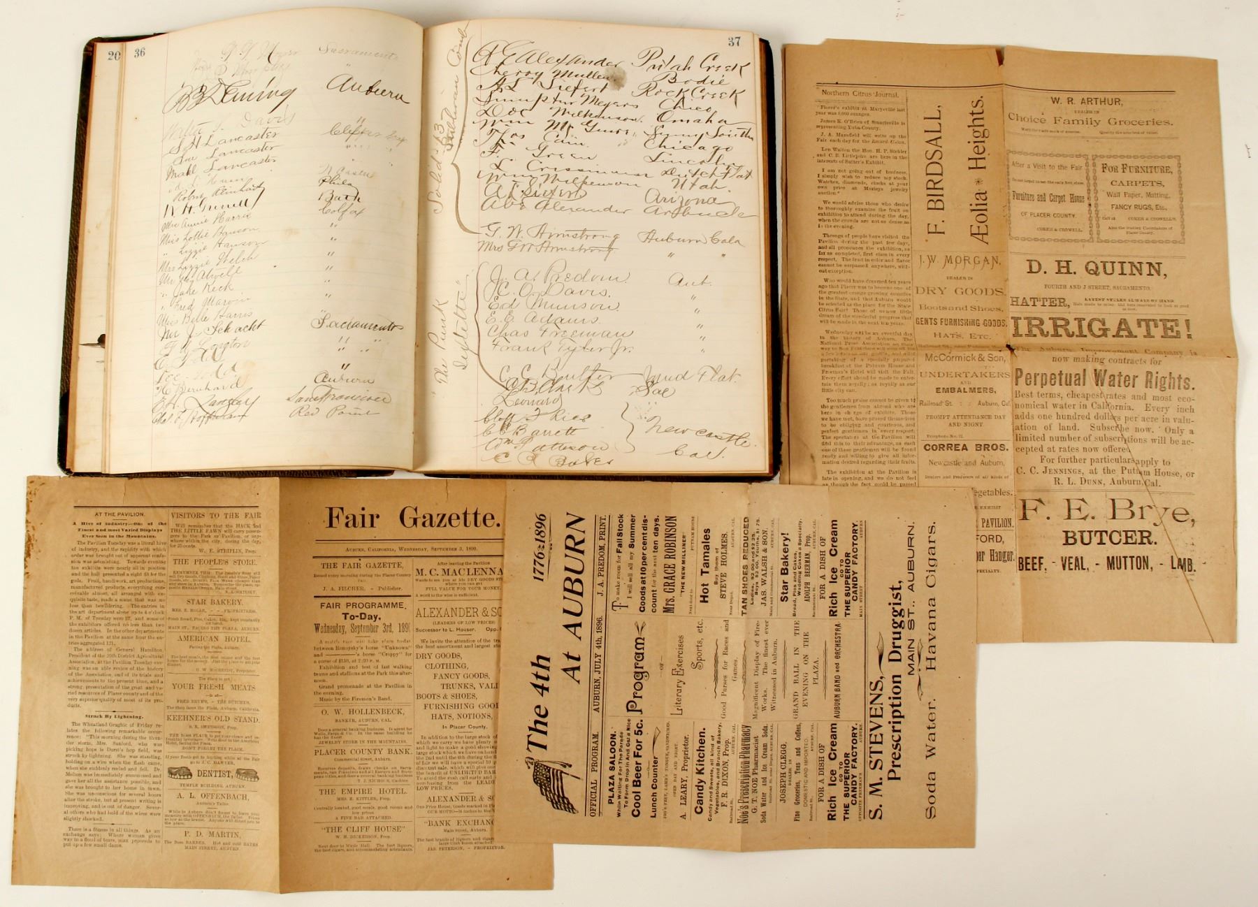 Visitors Register from 1st State Citrus Fair, Auburn, Cal. Jan 11-16 1892. Signatures of General Supt. Mrs. William B. Geitar(?); Fred C. Miles, of Pengryn, Chrm. Advisory Committee. Northern Citrus Journal (1892, , included) pp 38 of signatures, 8" x 10.5". Has condition issues with spine.Please inspect. Also scarlett broadside from 5th annual Fruit Growers Convention Oct 6 and 7, 14x11"
