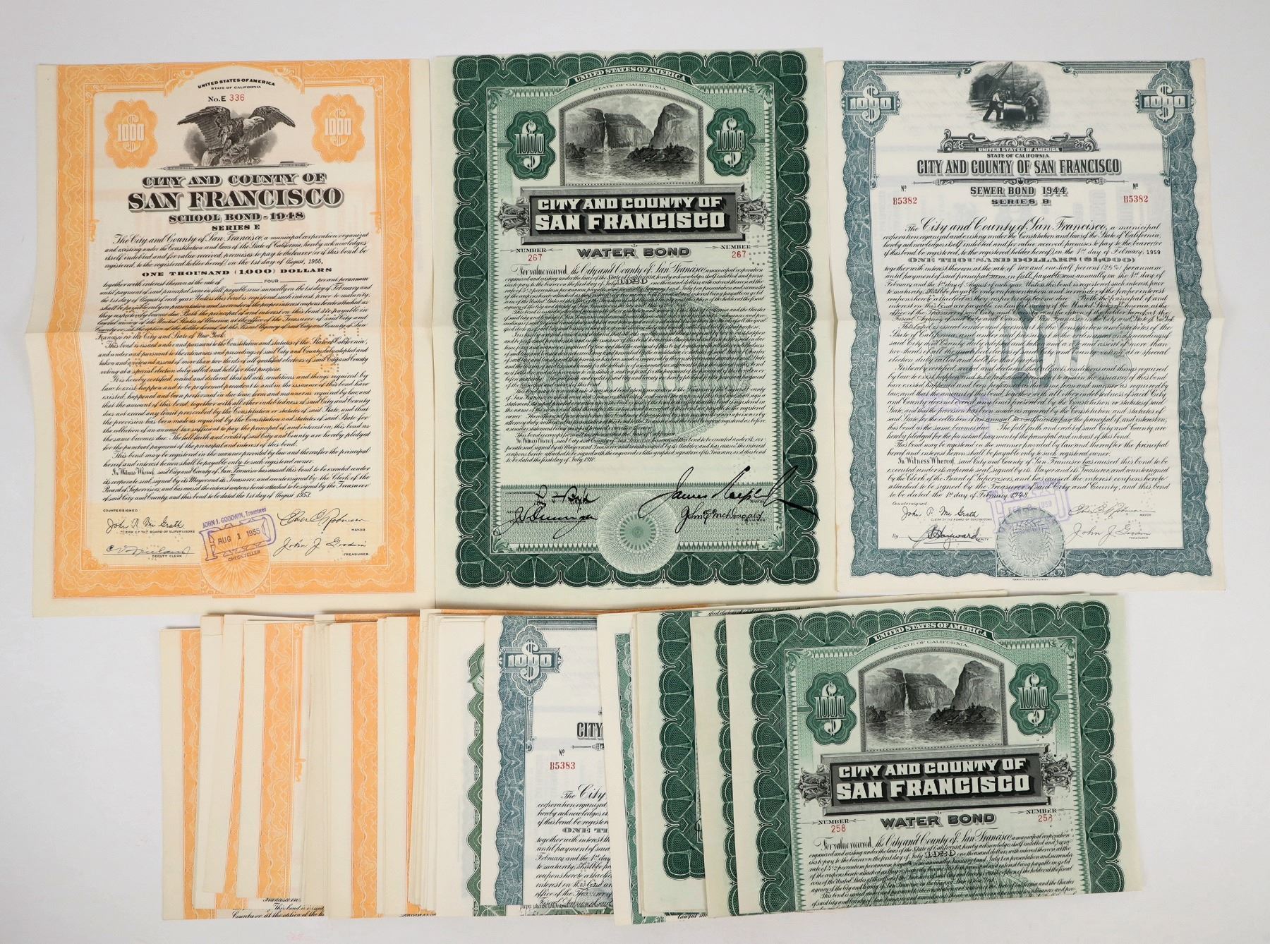 25+. I/C. Issued 1910-56 City And County Of San Francisco Bonds, three varieties. The bonds are for schools, water, sewer, hospitals and recreation. Security BNC printer.