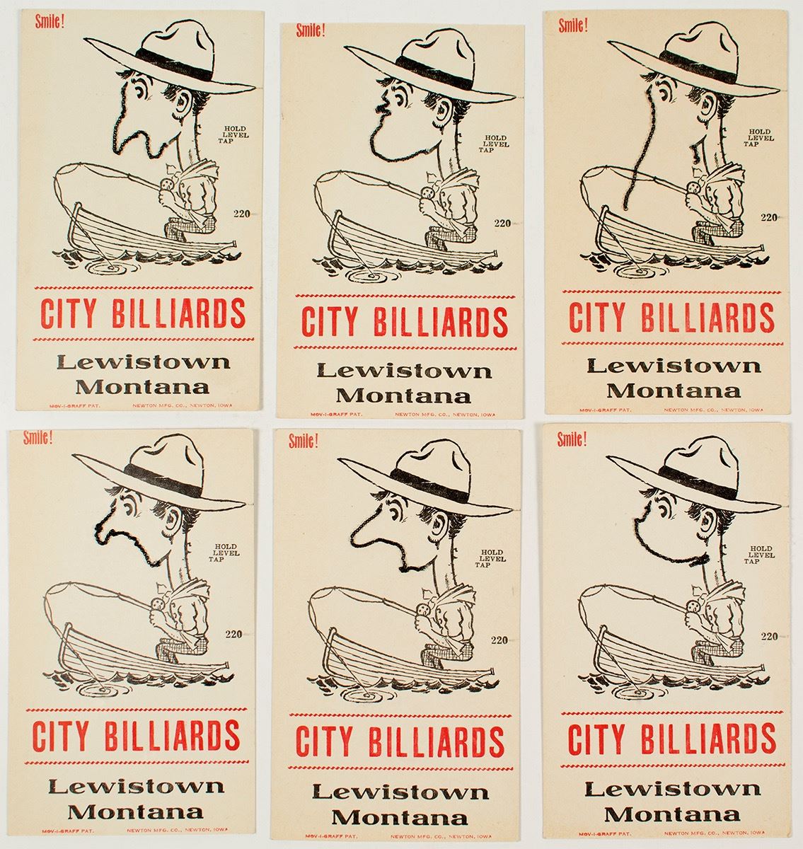 Six "Smile!" cards, 5.25" x 3.25" each. Advertising--City Billiards, Lewistown, Montana. Cartoon image of man fishing in a boat, small chain moves to draw face. Very clever!!! Date: Location: Lewistown, Montana HWAC# 38272