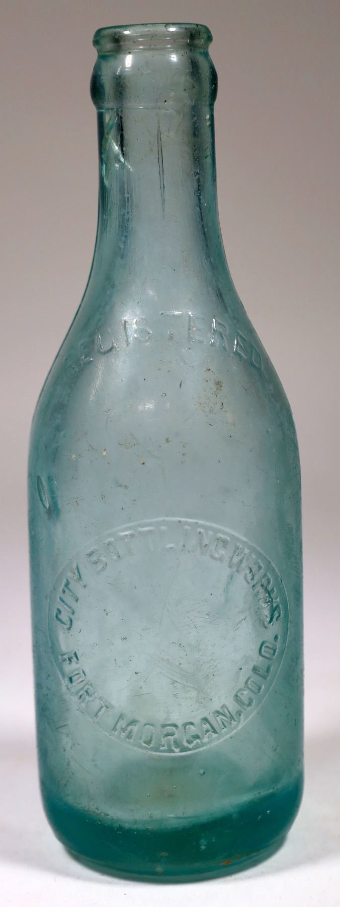 S 177 Aqua crown top Registered/City Bottling Works/Fort Morgon, Colo. Small stress crack in neck. No other apparent chips or cracks.