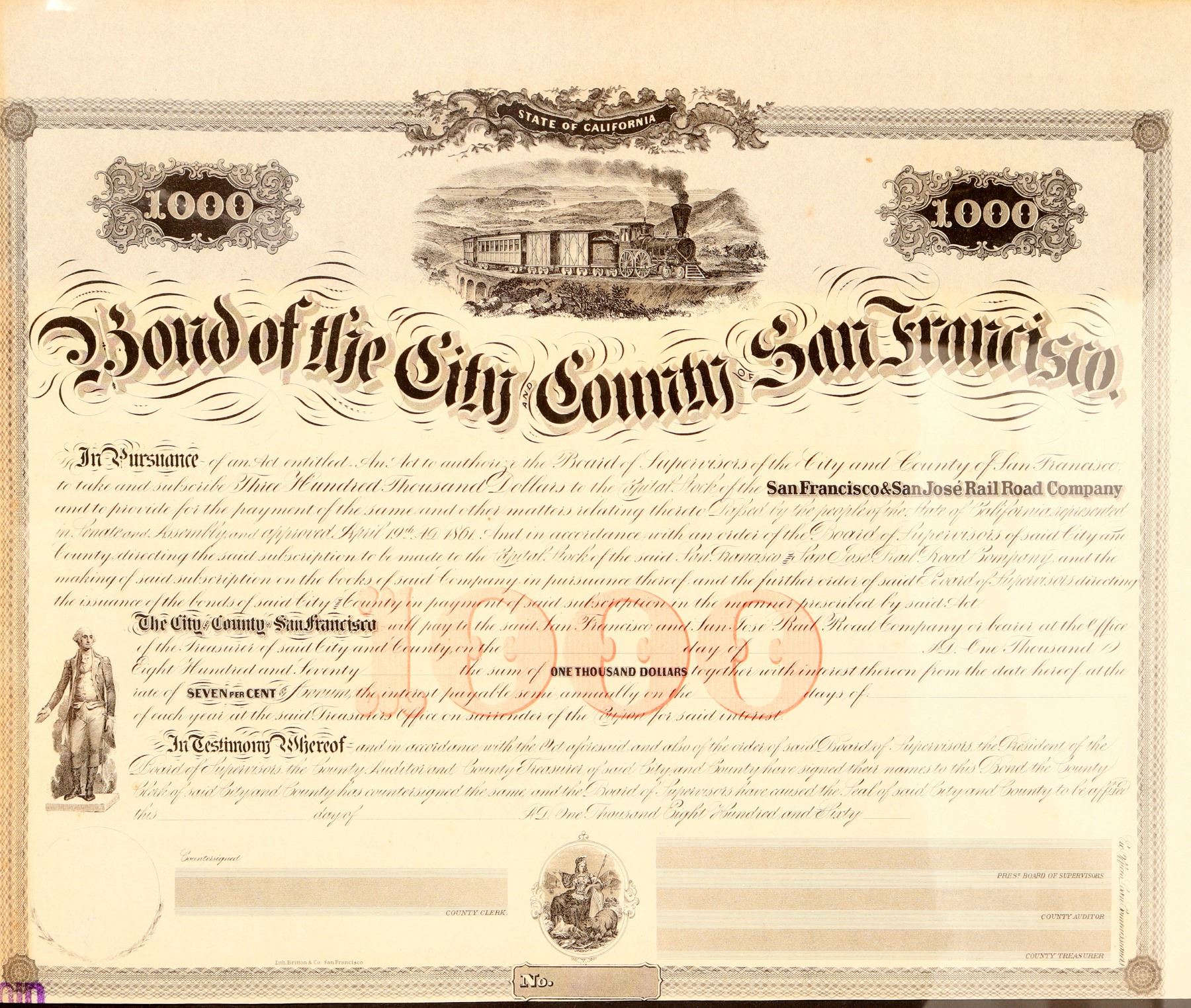 City & County San Francisco in aid of the San Francisco and San Jose Railroad Co. U/C, $1000 7% , due 187_. Issue dated for 186_ , BLACK, "VOID" purple stamp, vignettes: Lower left George Washington standing, bottom Calif seal, top 4-4-0 passenger train over bridge, "1000" red underprint, Britton & Co printers. All coupons attached. Tear upper right corner, no holes or folds, paper is crisp. Kept in protective cover. Not in any references for RR stocks or bonds. Might be the only known one. Ken Prag Collection