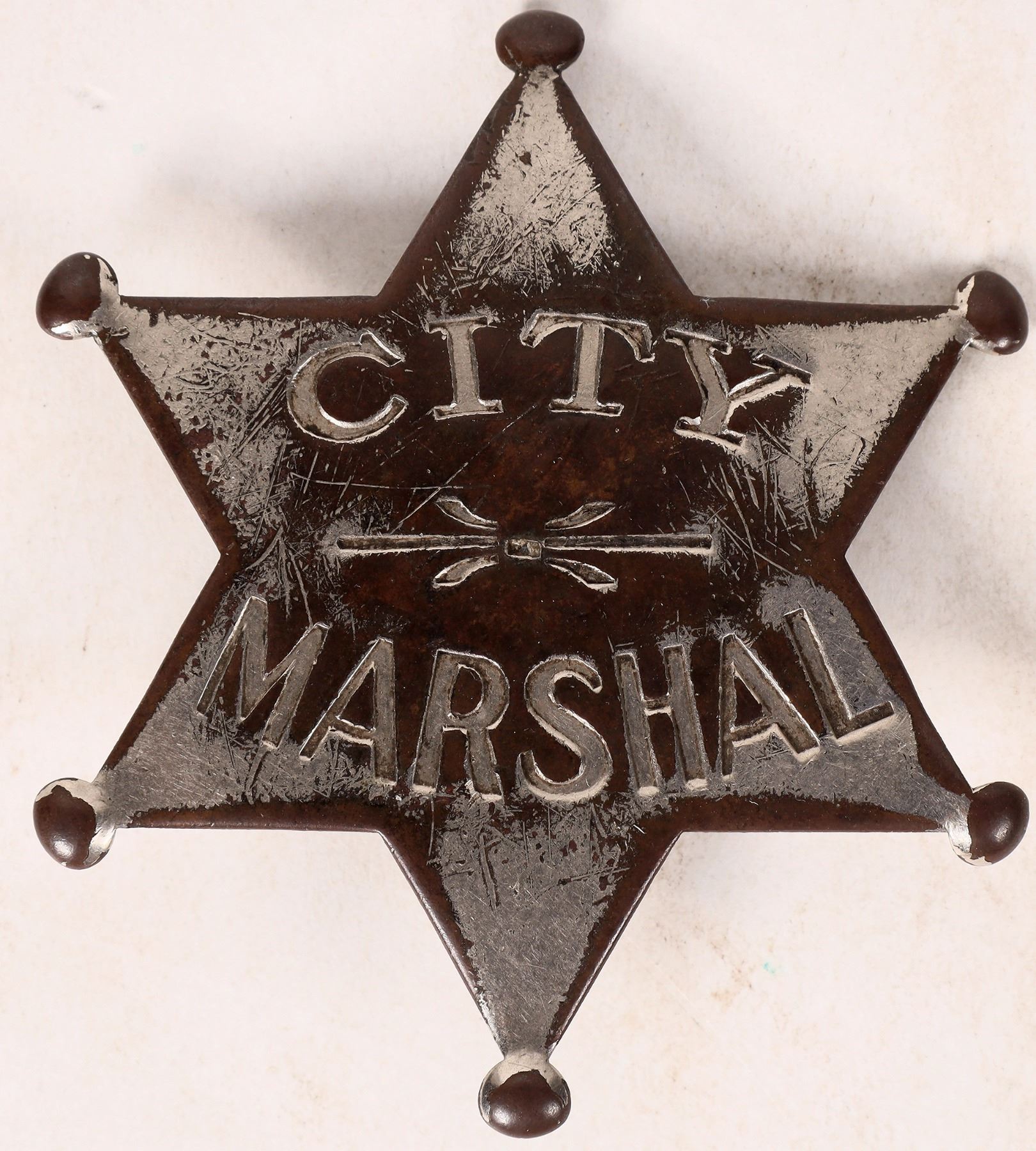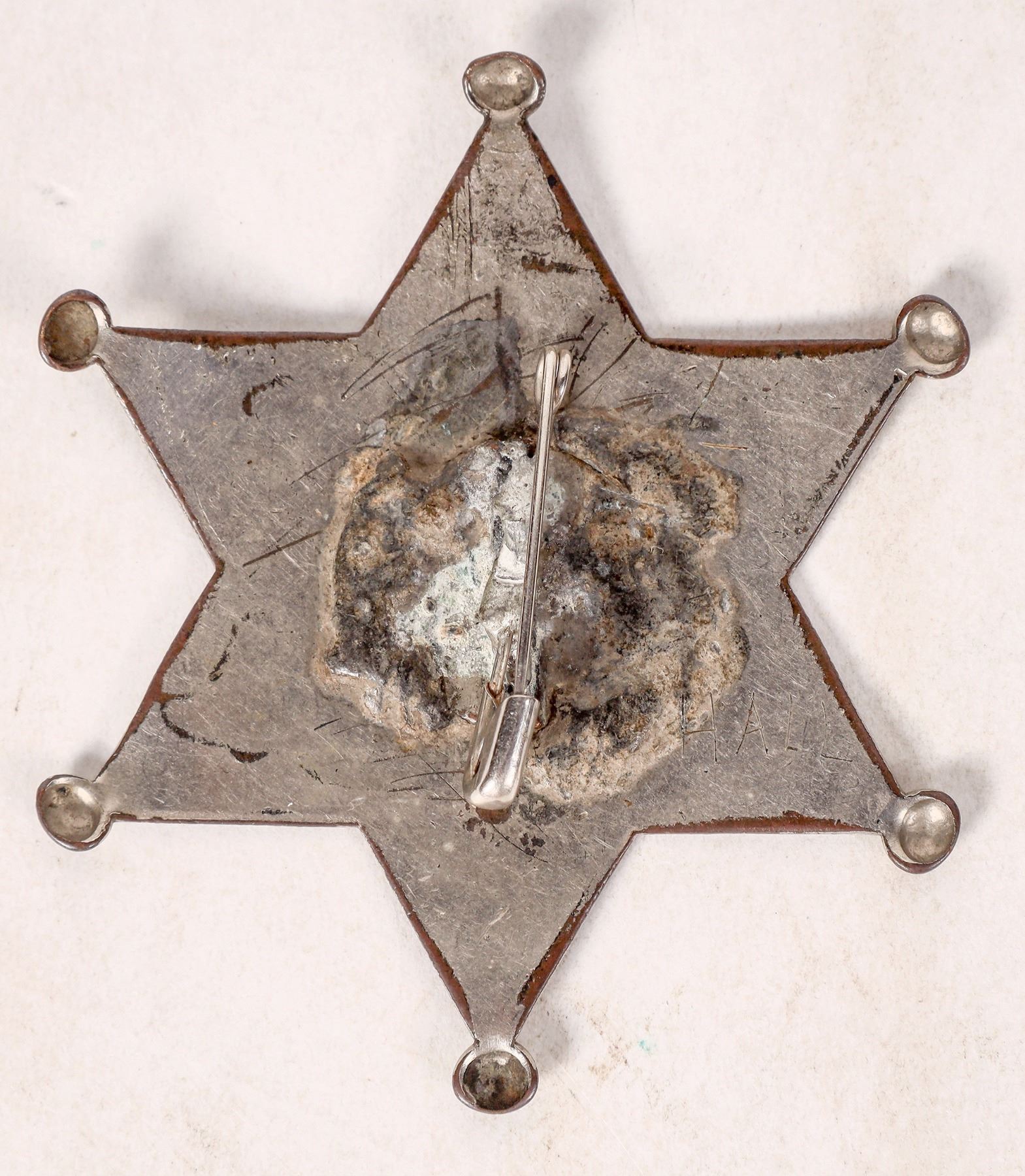 6 point star City Marshall badge. Ex Old West Auction, lot 47. Nickel plated copper, mostly worn down to brass. HALL etched on back. 2.5" with pinback.