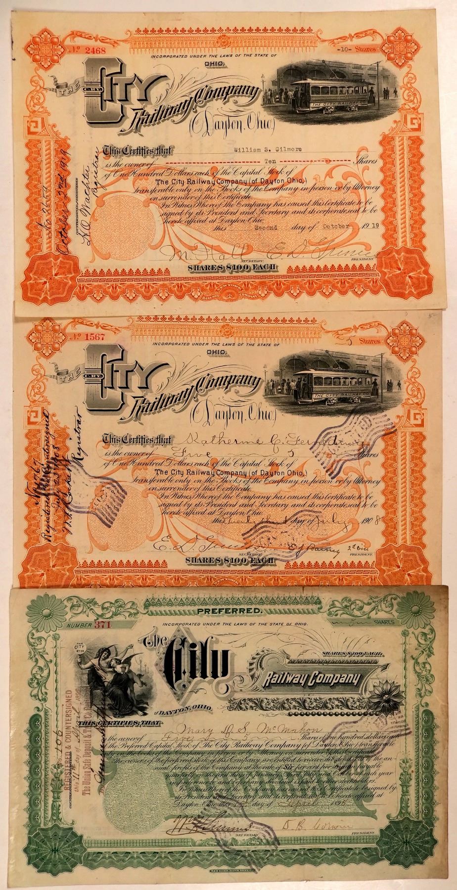 One preferred stock issued in 1895. Vignette of a topless woman holding a lamp that reads,"City Ry Co" with a small cherub with wings. New York Bank Note. Cancelled. Also, two common stocks issued in 1908 and 1919. Orange underprint and borders. Both have an electric streetcar that reads on the side, "The City Railway Co." The 1908 certificate is stamp cxled, but the 1919 certificate is uncancelled. These are also from New York Banknote Co.