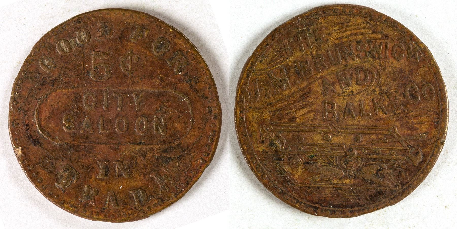 Obv.: Good For / 5c / City / Saloon / In / Trade; Rev.: The / J. M. Brunswick / And / Balke Co. / pictorial pool table. Br., rd., 24 mm. Unlisted, possibly Oklahoma City. Daniel Manasselian Collection. State: City: Date: ID# 78014
