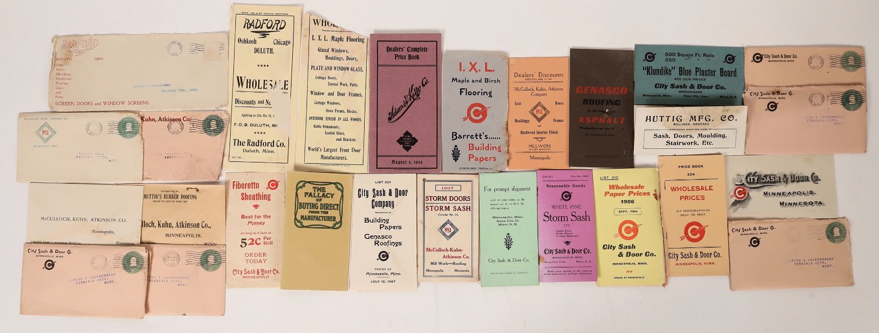 13 c. 1906-07 pieces from City Sash & Door Co. including covers and cover size catalogs. A few other door and sash items. Minnesota Minneapolis