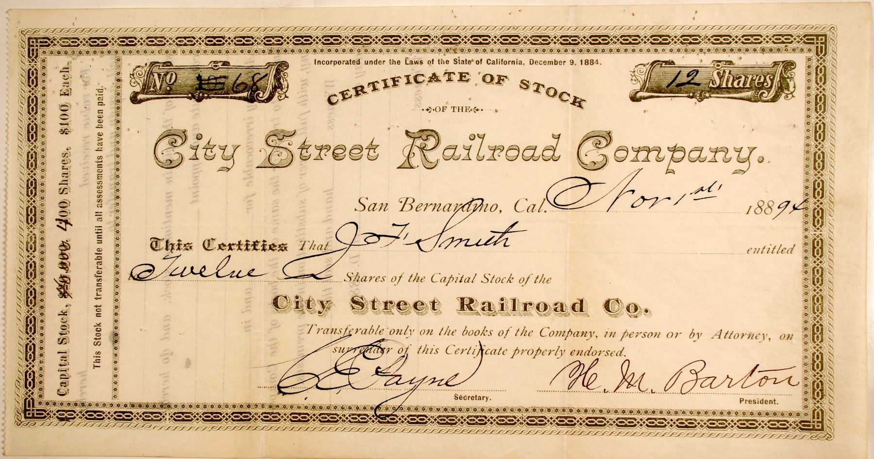 Certificate #68 for twelve shares of Capital Stock, issued Nov 1, 1894 to J. F. Smith, signed by president H. M. Barton. Uncancelled. The company was incorporated in 1894 in California. It operated horse-drawn (or more likely mule-drawn) streetcars though downtown San Bernardino.