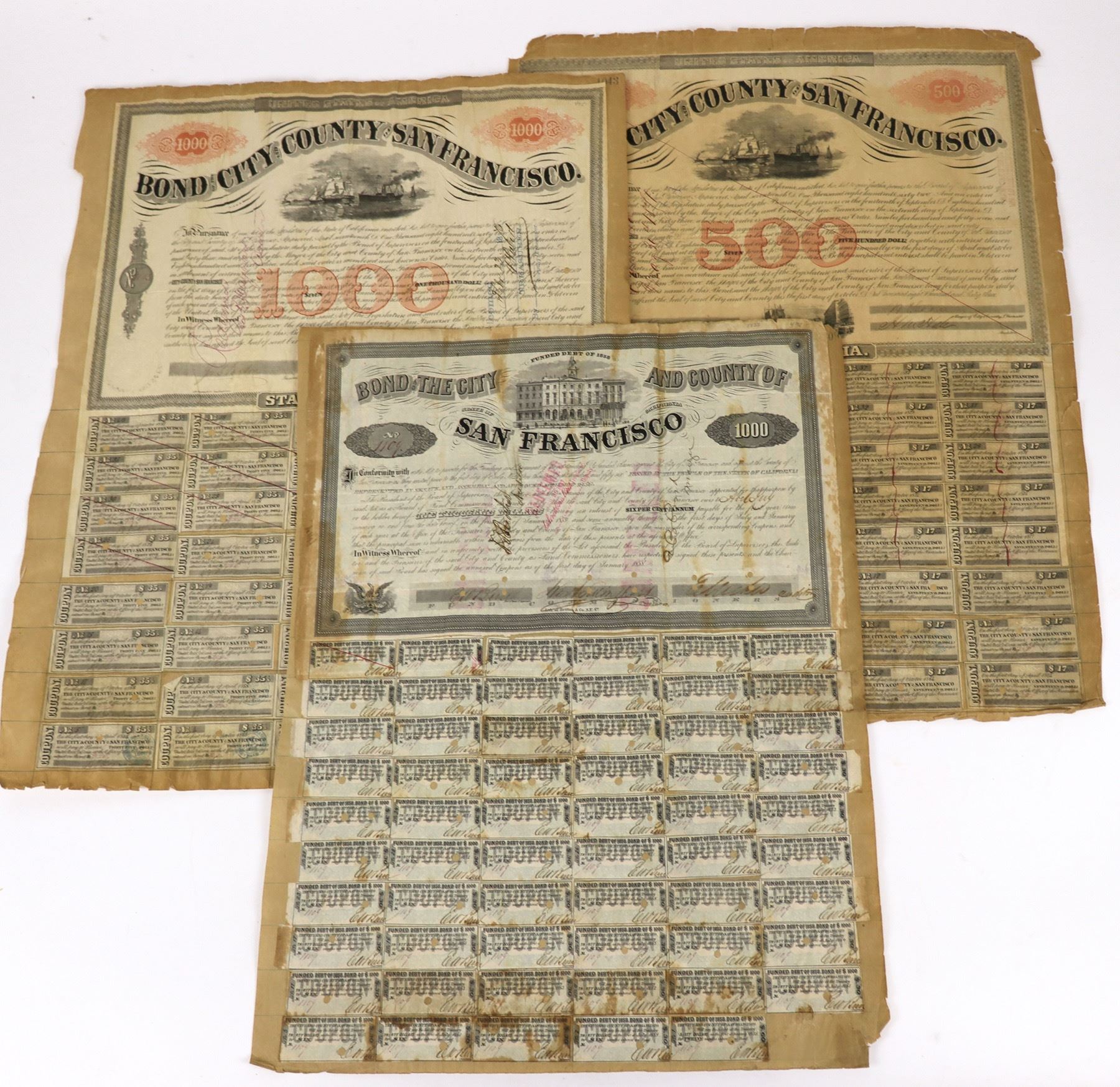 3 different City and County of San Francisco Bonds. $1000 1858, $500 1863, $1000 1863. City:San Francisco State:California Date: