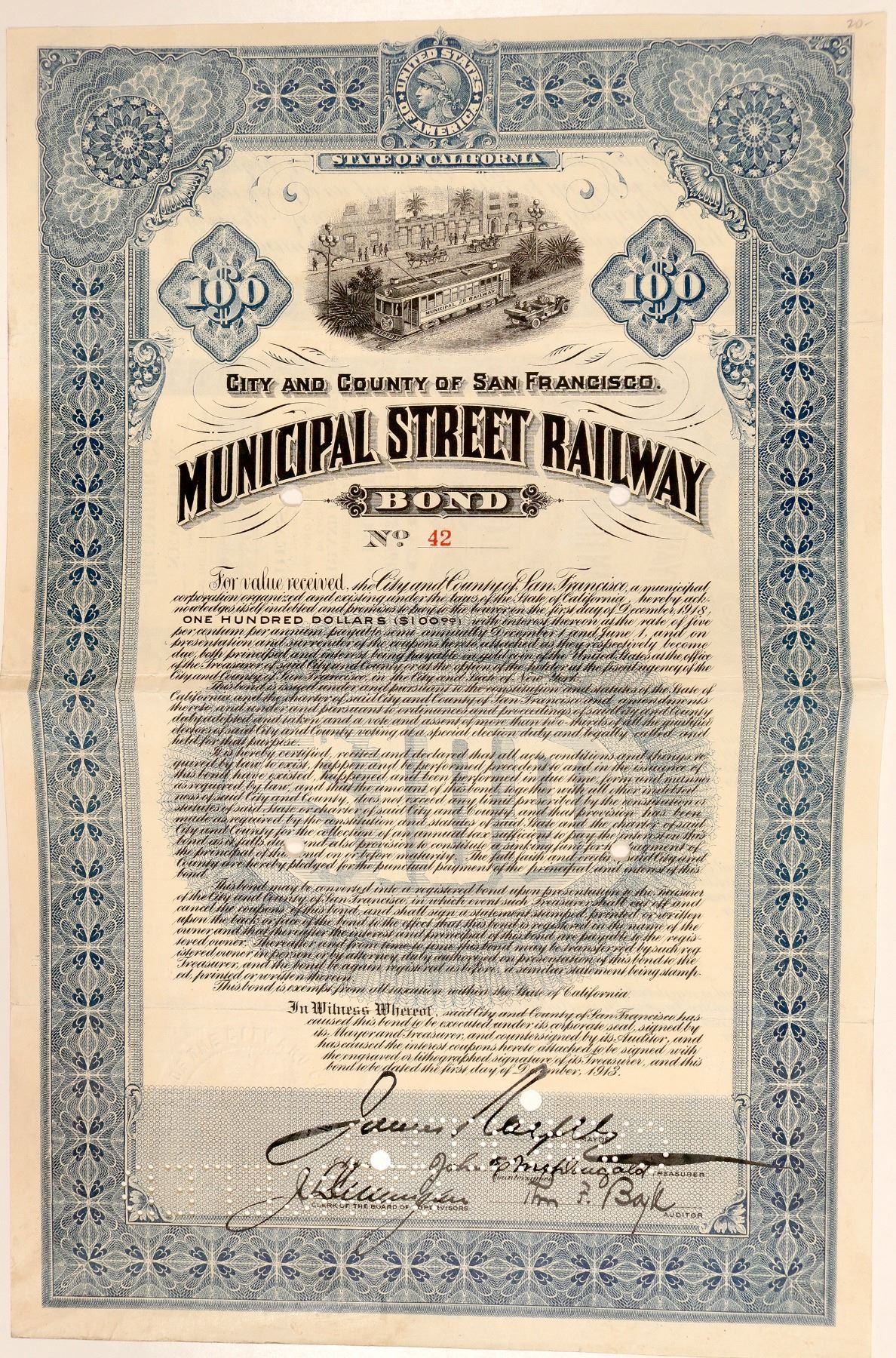 #42, I/C, $100 5% 5 yr. Municipal bearer bond due 1918. Issued Dec. 1, 1913. BLUE, embossed seal, vignette top electric street car #28 w/car passing by. "$100" white outline on green underprint. Cancelled punch holes. Britton & Rey Litho printer. EF Ken Prag Collection