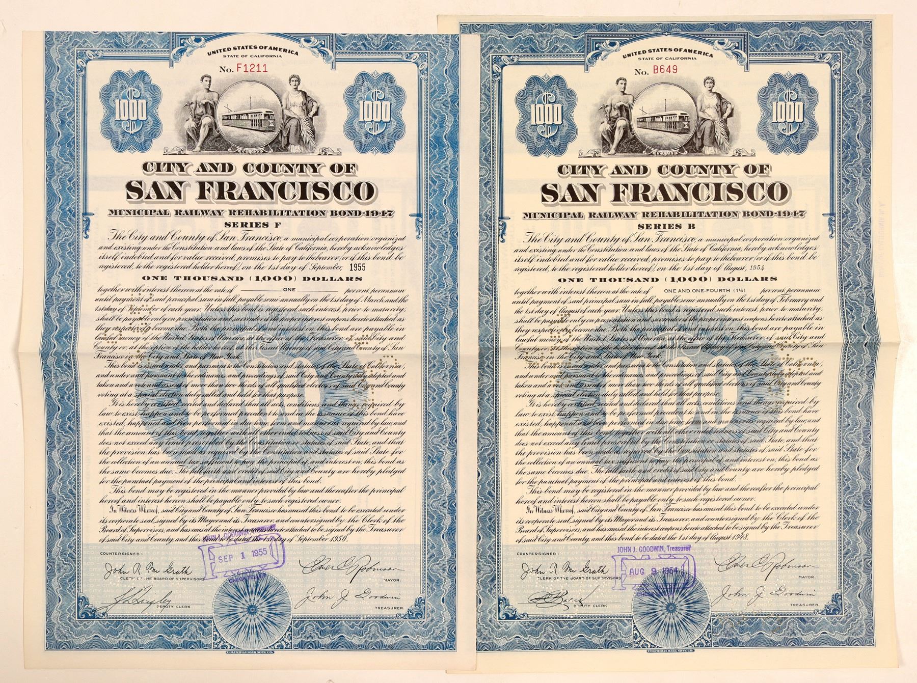 Two Municipal Railway Rehabilitation Bond 1947 issued and paid not cancelled. $1000, BLUE, vignette allegorical figures either side of electric rail car. 1000 in white outline over "$" in blue underprint oval. Embossed seal. Signed Elmer Robinson Mayor. Columbian Bank Note Co printer. #f1211 1 %, series F, due 1955 and #B649 series B 1 1/4 % due 1954.AU Ken Prag Collection