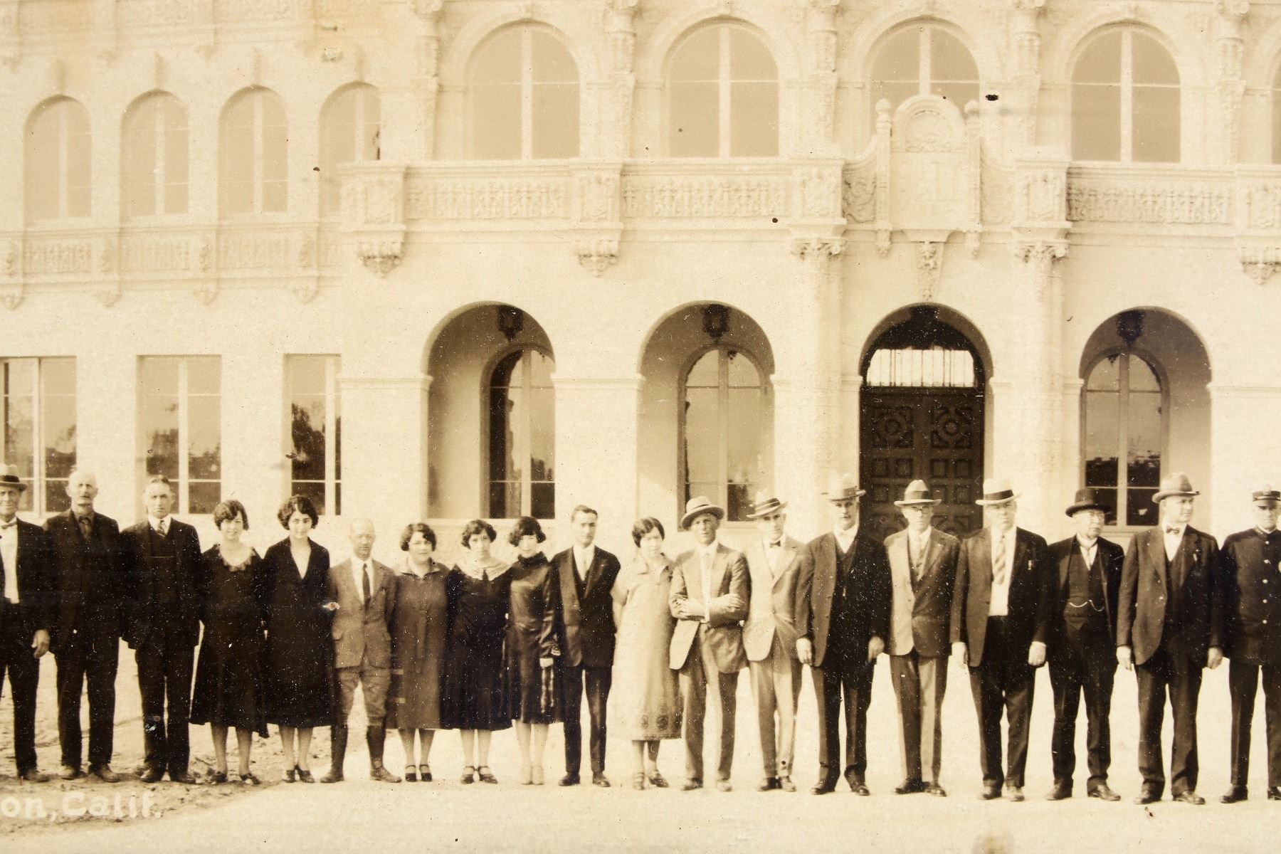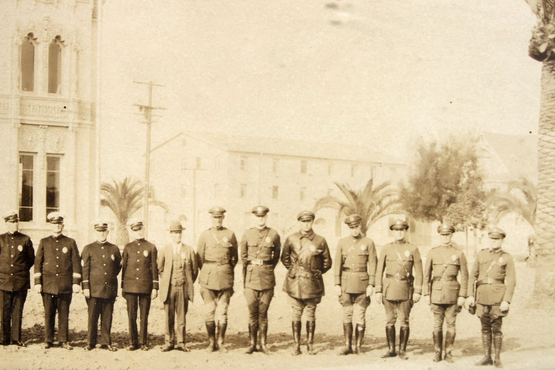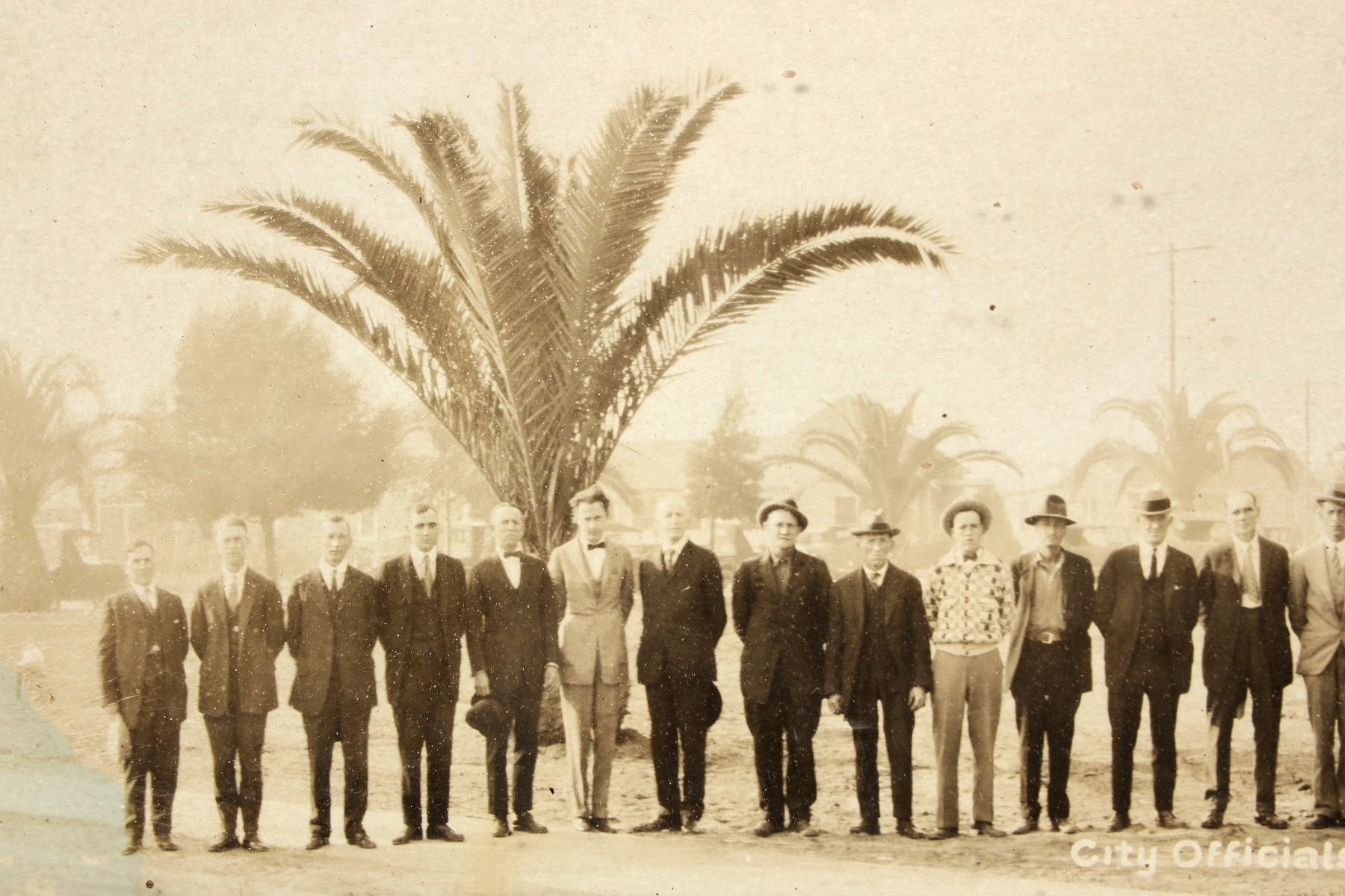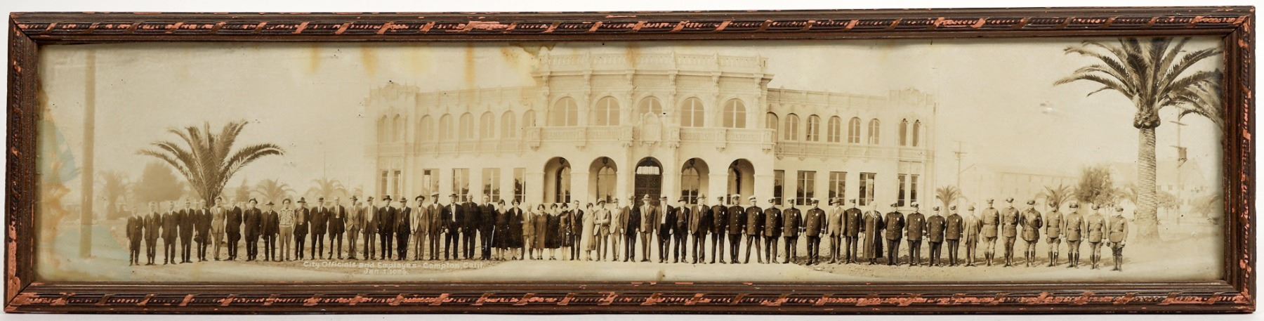 Large panorama B&W framed photo. Appears to be all of the City of Compton's employees. Police and Fire (in uniforms), Men and Women, all neatly lined up for this photograph. They are in front of what appears to be City Hall, on a palm tree lined street. Good clarity, some fade, staining at edges and top. Frame measures approx. 30.5" long x 7.5" high.