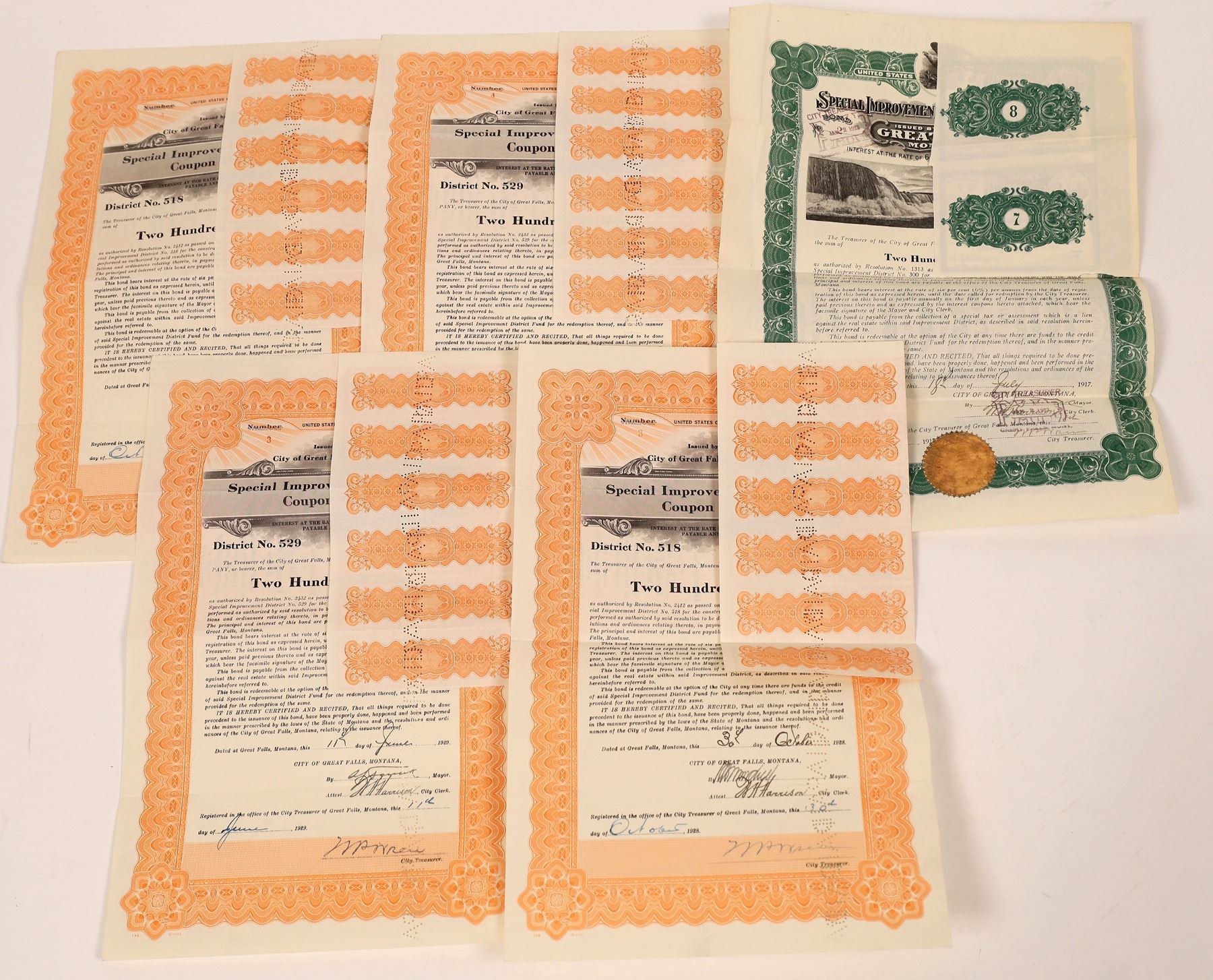 Lot of five special improvement district coupon bonds from the city of Great Falls. Early bond numbers 2-4, with each bond for a different district. Some coupons still attached.