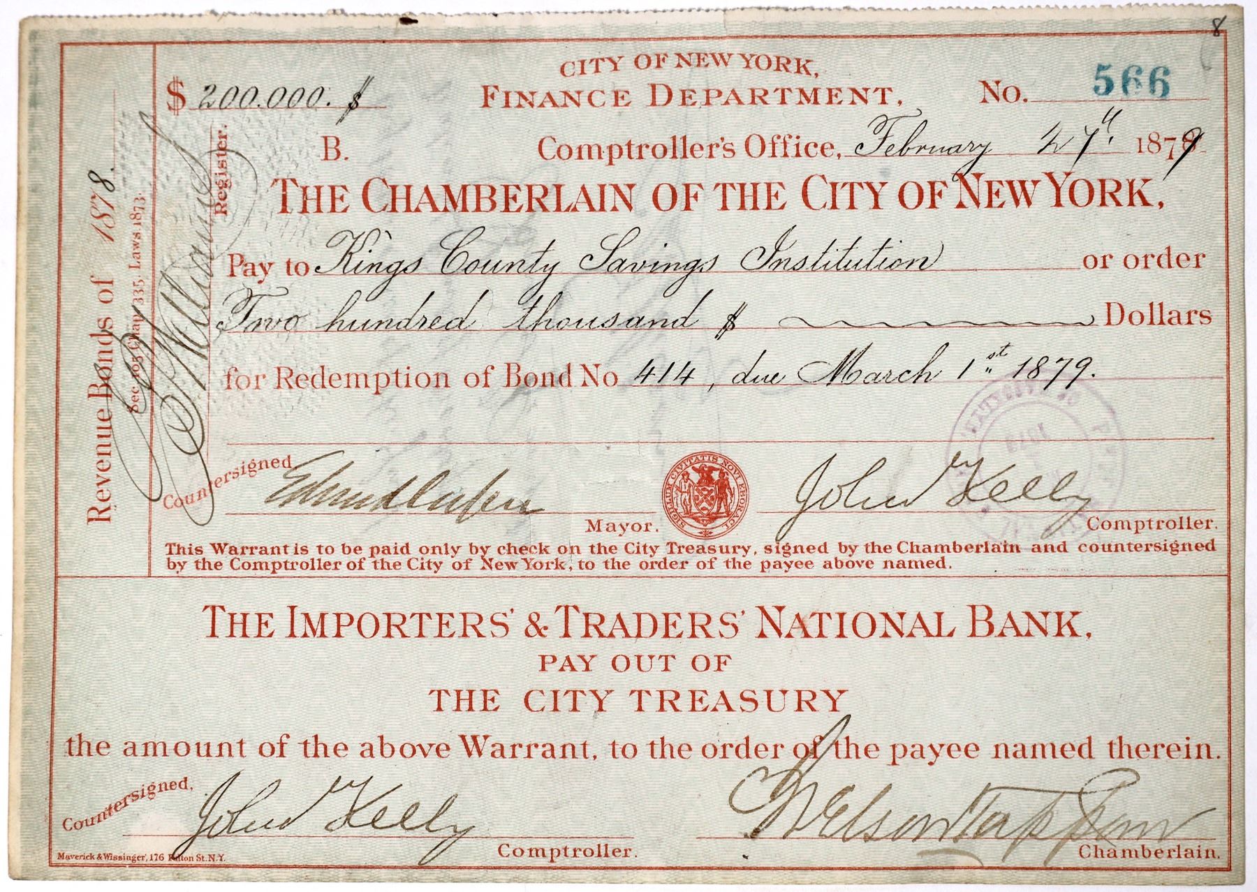 The Chamberlain of the City of New York 1879 check for $200,000 payable to Kings County savings institution. Signed by mayor ?, Chamberlain Nelson ? and comptroller ?.